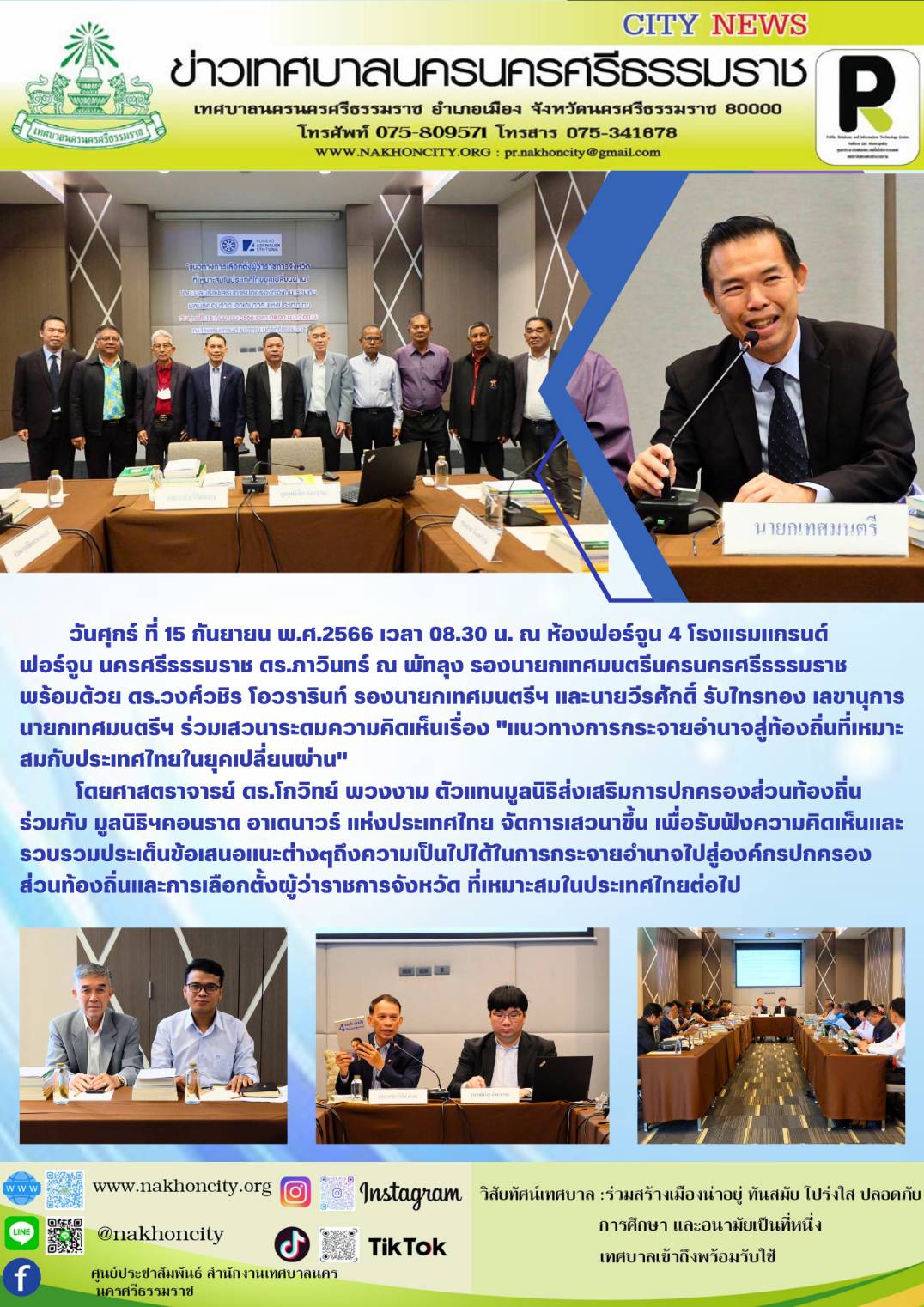 | วันศุกร์ ที่ 15 กันยายน  พ.ศ.2566 เวลา 08.30 น. ณ ห้องฟอร์จูน 4 โรงแรมแกรนด์ ฟอร์จูน นครศรีธรรมราช ดร.ภาวินทร์ ณ พัทลุง รองนายกเทศมนตรีนครนครศรีธรรมราช พร้อมด้วย ดร.วงศ์วชิร โอวรารินท์  รองนายกเทศมนตรีฯ และนายวีรศักดิ์ รับไทรทอง เลขานุการนายกเทศมนตรีฯ ร่วมเสวนาระดมความคิดเห็นเรื่อง "แนวทางการกระจายอำนาจสู่ท้องถิ่นที่เหมาะสมกับประเทศไทยในยุคเปลี่ยนผ่าน" โดยศาสตราจารย์ ดร.โกวิทย์ พวงงาม ตัวแทนมูลนิธิส่งเสริมการปกครองส่วนท้องถิ่น ร่วมกับ มูลนิธิฯคอนราด อาเดนาวร์ แห่งประเทศไทย จัดการเสวนาขึ้น เพื่อรับฟังความคิดเห็นและรวบรวมประเด็นข้อเสนอแนะต่างๆถึงความเป็นไปได้ในการกระจายอำนาจไปสู่องค์กรปกครองส่วนท้องถิ่นและการเลือกตั้งผู้ว่าราชการจังหวัด ที่เหมาะสมในประเทศไทยต่อไป |