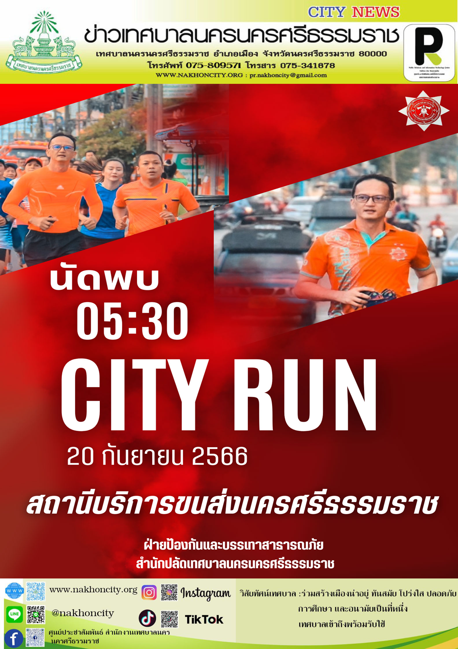 | เทศบาลนครนครศรีธรรมราช ภายใต้การนำ ดร.กณพ เกตุชาติ นายกเทศมนตรีนครนครศรีธรรมราช เชิญชวนประชาชน ร่วมวิ่งออกกำลังกาย ทุกเช้าวันพุธ เวลา 05.30 น.เป็นต้นไป กับกิจกรรม "City Run" พร้อมกับ เจ้าหน้าฝ่ายป้องกันและบรรเทาสาธารณภัย และบุคลากร ของ เทศบาลนครนครศรีธรรมราช ซึ่งใน วันพุธที่ 20 กันยายน 2566 นี้ ขอเชิญชวนผู้ที่จะเข้าร่วมกิจกรรมทุกท่าน พบกันที่ สถานีขนส่ง วิ่งไปทางถนนชลประทาน เลี้ยวซ้ายที่ซอยทุ่งจีน ออกถนนกะโรม วิ่งกลับมาที่สถานีขนส่ง เพื่อสร้างสุขภาพร่างกายที่ดี ไปด้วยกันกับเทศบาลนครนครศรีธรรมราช
