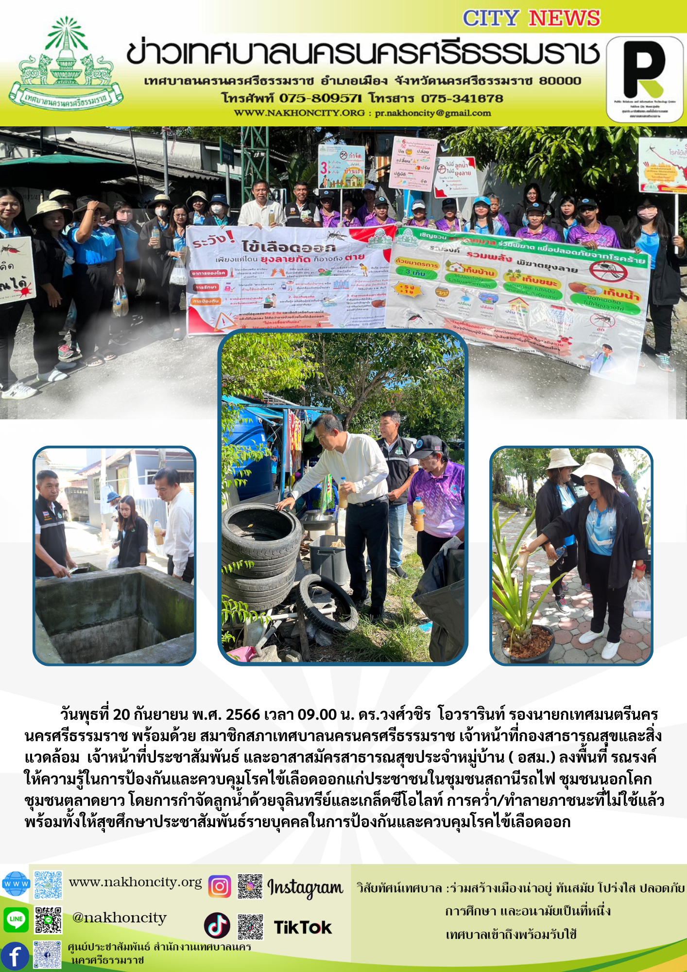 | ดร.วงศ์วชิร โอวรารินท์ รองนายกเทศมนตรีนครนครศรีธรรมราช พร้อมด้วย สมาชิกสภาเทศบาลนครนครศรีธรรมราช เจ้าหน้าที่กองสาธารณสุขและสิ่งแวดล้อม เจ้าหน้าที่ประชาสัมพันธ์ และอาสาสมัครสาธารณสุขประจำหมู่บ้าน ( อสม.) ลงพื้นที่ รณรงค์ให้ความรู้ในการป้องกันและควบคุมโรคไข้เลือดออกแก่ประชาชนในชุมชนสถานีรถไฟ ชุมชนนอกโคก ชุมชนตลาดยาว |