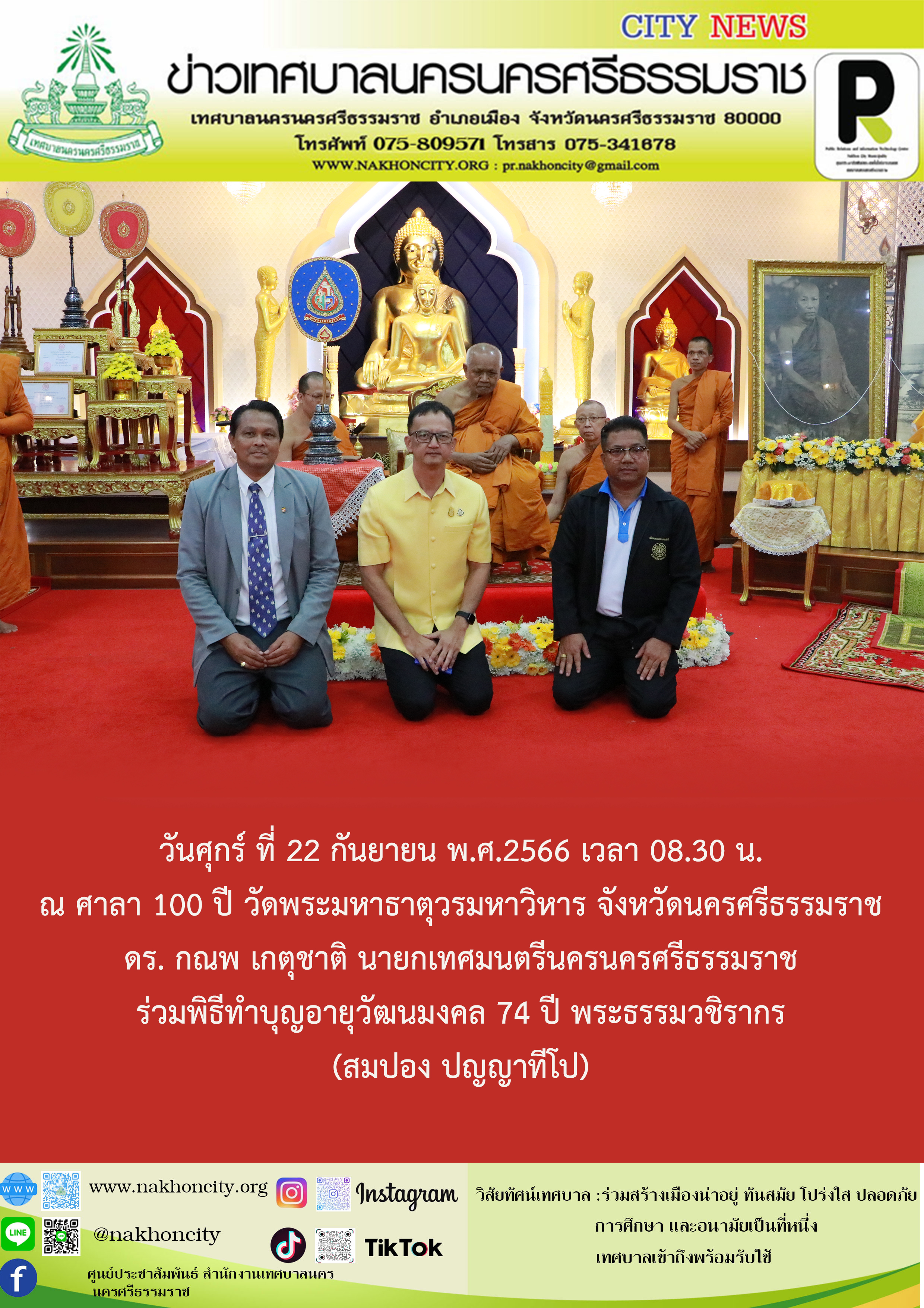 | ดร. กณพ เกตุชาติ นายกเทศมนตรีนครนครศรีธรรมราช ร่วมพิธีทำบุญอายุวัฒนมงคล 74 ปี พระธรรมวชิรากร (สมปอง ปญญาทีโป) |