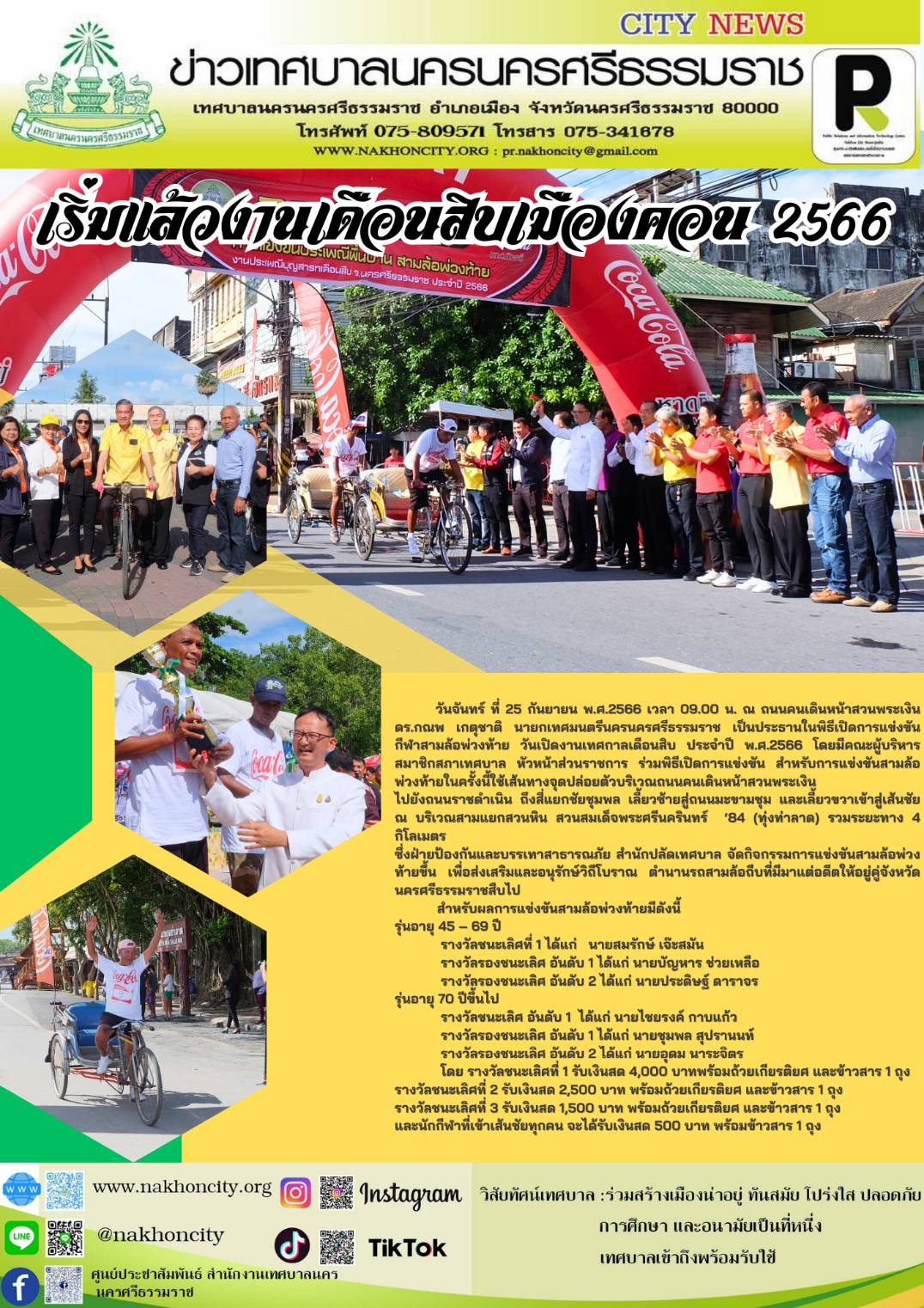 | วันจันทร์ ที่ 25 กันยายน พ.ศ.2566 เวลา 09.00 น. ณ ถนนคนเดินหน้าสวนพระเงิน ดร.กณพ เกตุชาติ นายกเทศมนตรีนครนครศรีธรรมราช เป็นประธานในพิธีเปิดการแข่งขันกีฬาสามล้อพ่วงท้าย วันเปิดงานเทศกาลเดือนสิบ ประจำปี พ.ศ.2566 โดยมีคณะผู้บริหาร สมาชิกสภาเทศบาล หัวหน้าส่วนราชการ ร่วมพิธีเปิดการแข่งขัน สำหรับการแข่งขันสามล้อพ่วงท้ายในครั้งนี้ใช้เส้นทางจุดปล่อยตัวบริเวณถนนคนเดินหน้าสวนพระเงิน ไปยังถนนราชดำเนิน ถึงสี่แยกชัยชุมพล เลี้ยวซ้ายสู่ถนนมะขามชุม และเลี้ยวขวาเข้าสู่เส้นชัย ณ บริเวณสามแยกสวนหิน สวนสมเด็จพระศรีนครินทร์ ‘84 (ทุ่งท่าลาด) รวมระยะทาง 4 กิโลเมตร ซึ่งฝ่ายป้องกันและบรรเทาสาธารณภัย สำนักปลัดเทศบาล จัดกิจกรรมการแข่งขันสามล้อพ่วงท้ายขึ้น เพื่อส่งเสริมและอนุรักษ์วิถีโบราณ ตำนานรถสามล้อถีบที่มีมาแต่อดีตให้อยู่คู่จังหวัดนครศรีธรรมราชสืบไป สำหรับผลการแข่งขันสามล้อพ่วงท้ายมีดังนี้ รุ่นอายุ 45 – 69 ปี รางวัลชนะเลิศที่ 1 ได้แก่ นายสมรักษ์ เจ๊ะสมัน รางวัลรองชนะเลิศ อันดับ 1 ได้แก่ นายบัญหาร ช่วยเหลือ รางวัลรองชนะเลิศ อันดับ 2 ได้แก่ นายประดิษฐ์ ดาราจร รุ่นอายุ 70 ปีขึ้นไป รางวัลชนะเลิศ อันดับ 1 ได้แก่ นายไชยรงค์ กาบแก้ว รางวัลรองชนะเลิศ อันดับ 1 ได้แก่ นายชุมพล สุปรานนท์ รางวัลรองชนะเลิศ อันดับ 2 ได้แก่ นายอุดม นาระจิตร โดย รางวัลชนะเลิศที่ 1 รับเงินสด 4,000 บาทพร้อมถ้วยเกียรติยศ และข้าวสาร 1 ถุง รางวัลชนะเลิศที่ 2 รับเงินสด 2,500 บาท พร้อมถ้วยเกียรติยศ และข้าวสาร 1 ถุง รางวัลชนะเลิศที่ 3 รับเงินสด 1,500 บาท พร้อมถ้วยเกียรติยศ และข้าวสาร 1 ถุง และนักกีฬาที่เข้าเส้นชัยทุกคน จะได้รับเงินสด 500 บาท พร้อมข้าวสาร 1 ถุง ............ ภาพ//ข่าว//จันทร์จิรา ตรวจทาน//ฐิตินันท์ |