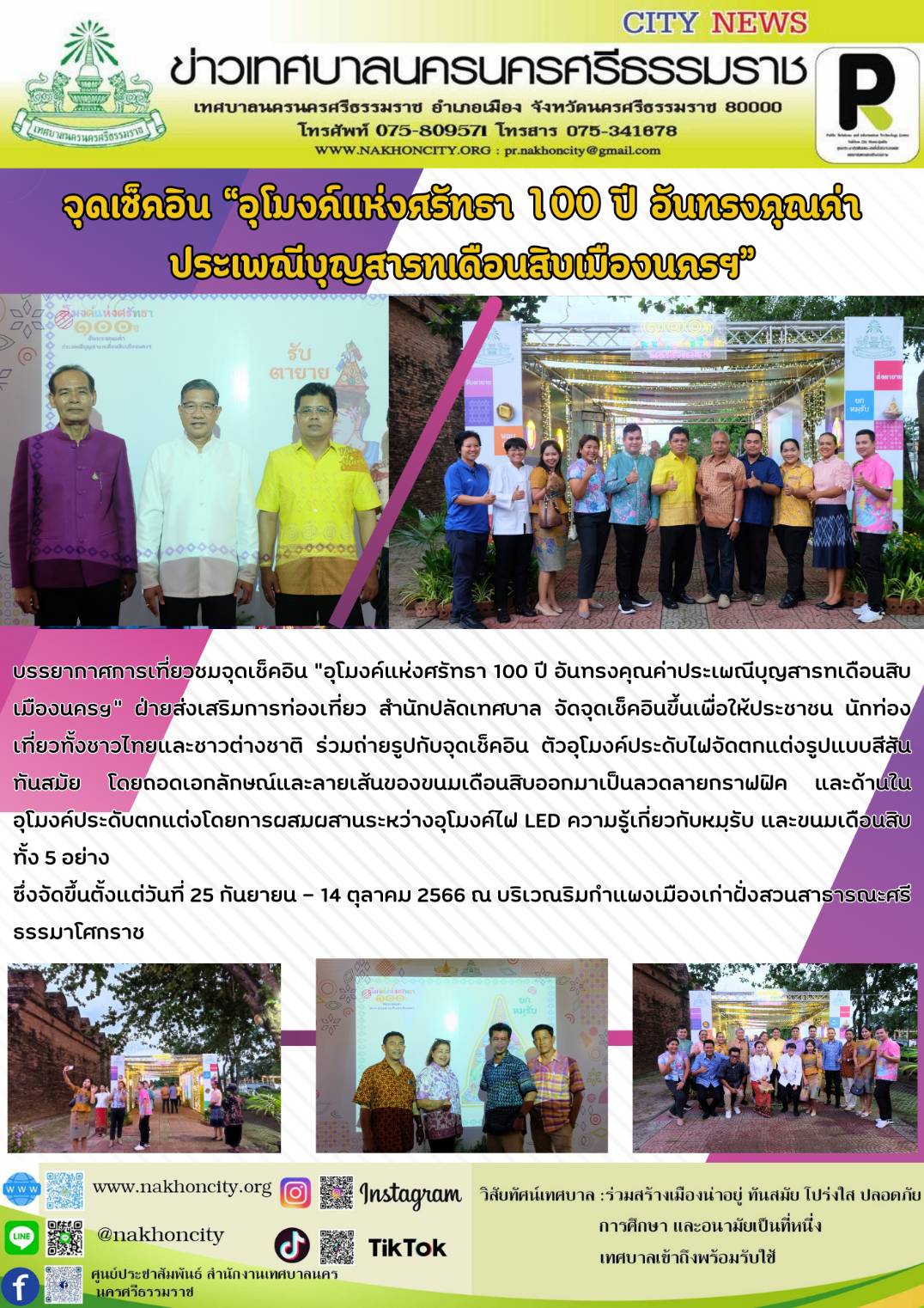 | บรรยากาศการเที่ยวชมจุดเช็คอิน “อุโมงค์แห่งศรัทธา 100 ปี อันทรงคุณค่าประเพณีบุญสารทเดือนสิบเมืองนครฯ” ฝ่ายส่งเสริมการท่องเที่ยว สำนักปลัดเทศบาล จัดจุดเช็คอินขึ้นเพื่อให้ประชาชน นักท่องเที่ยวทั้งชาวไทยและชาวต่างชาติ ร่วมถ่ายรูปกับจุดเช็คอิน ตัวอุโมงค์ประดับไฟจัดตกแต่งรูปแบบสีสันทันสมัย โดยถอดเอกลักษณ์และลายเส้นของขนมเดือนสิบออกมาเป็นลวดลายกราฟฟิค และด้านในอุโมงค์ประดับตกแต่งโดยการผสมผสานระหว่างอุโมงค์ไฟ LED ความรู้เกี่ยวกับหมฺรับ และขนมเดือนสิบทั้ง 5 อย่าง ซึ่งจัดขึ้นตั้งแต่วันที่ 25 กันยายน – 14 ตุลาคม 2566 ณ บริเวณริมกำแพงเมืองเก่าฝั่งสวนสาธารณะศรีธรรมาโศกราช |