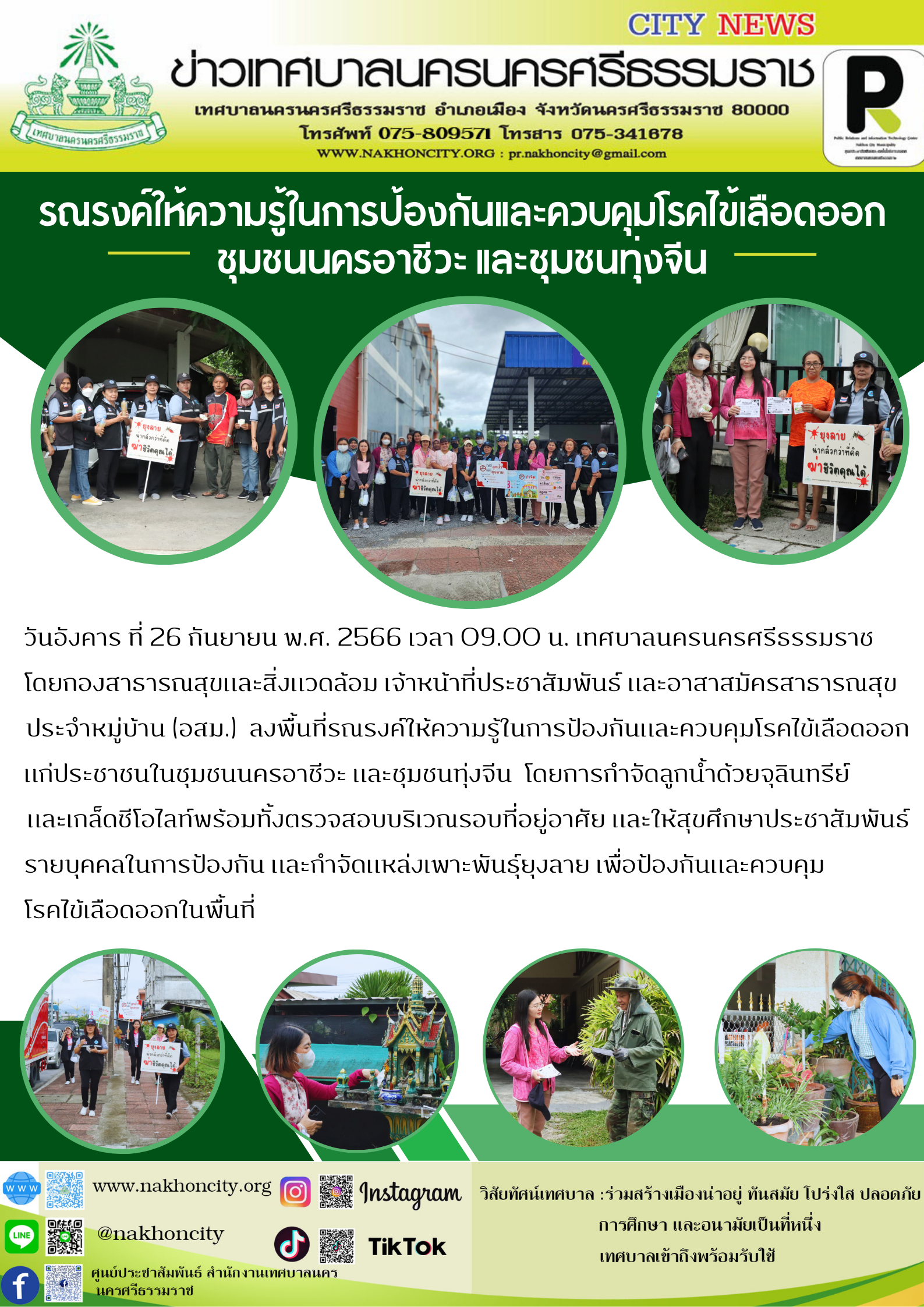 | เทศบาลนครนครศรีธรรมราช ลงพื้นที่รณรงค์ให้ความรู้ในการป้องกันและควบคุมโรคไข้เลือดออกแก่ประชาชนในชุมชนนครอาชีวะ และชุมชนทุ่งจีน |