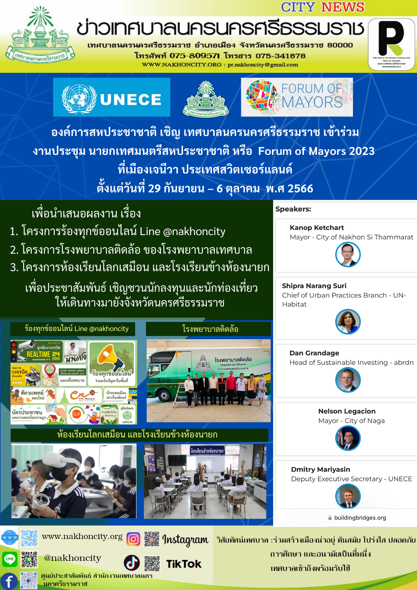 | องค์การสหประชาชาติ เชิญ เทศบาลนครนครศรีธรรมราช เข้าร่วม งานประชุม นายกเทศมนตรีสหประชาชาติ หรือ Forum of Mayors 2023 ที่เมืองเจนีวา ประเทศสวิตเซอร์แลนด์ ตั้งแต่วันที่ 29 กันยายน – 6 ตุลาคม พ.ศ 2566 เพื่อนำเสนอผลงาน เรื่อง 1.โครงการร้องทุกข์ออนไลน์ @nakhoncity 2.โครงการโรงพยาบาลติดล้อ ของโรงพยาบาลเทศบาล 3.โครงการห้องเรียนโลกเสมือน และโรงเรียนข้างห้องนายก เพื่อประชาสัมพันธ์ เชิญชวนนักลงทุนและนักท่องเที่ยว ให้เดินทางมายังจังหวัดนครศรีธรรมราช