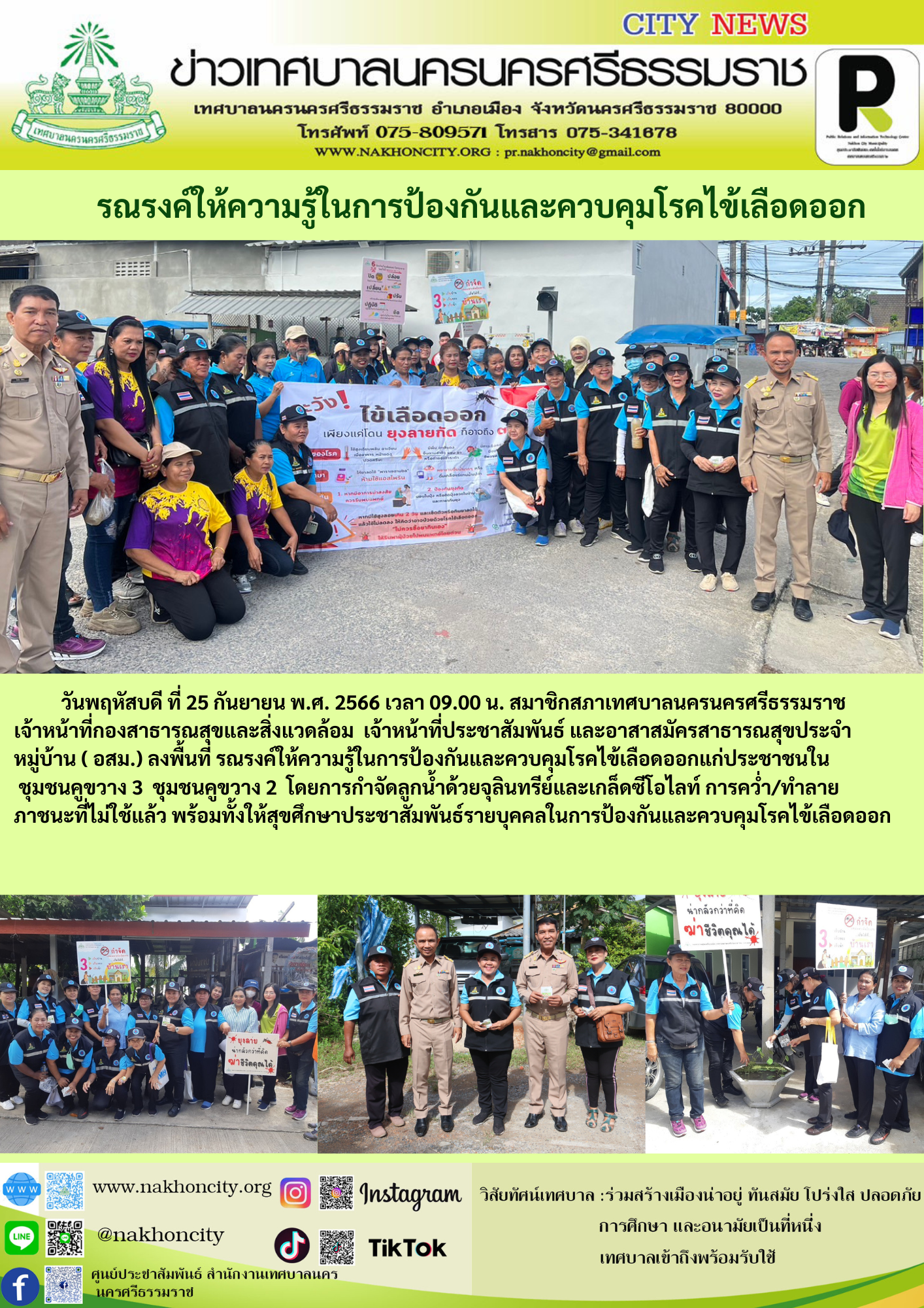 | กองสาธารณสุขและสิ่งแวดล้อมเทศบาลนครนครศรีธรรมราช ลงพื้นที่รณรงค์ให้ความรู้ในการป้องกันและควบคุมโรคไข้เลือดออก |