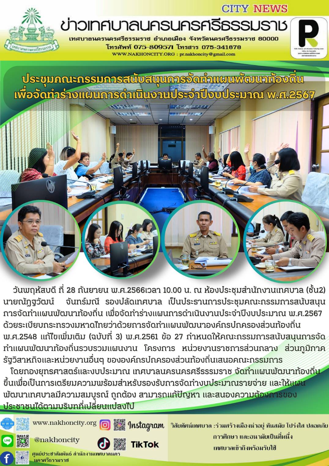 | วันพฤหัสบดี ที่ 28 กันยายน พ.ศ.2566เวลา 10.00 น. ณ ห้องประชุมสำนักงานเทศบาล (ชั้น2) นายณัฏฐวัฒน์  จันทร์มณี รองปลัดเทศบาล เป็นประธานการประชุมคณะกรรมการสนับสนุนการจัดทำแผนพัฒนาท้องถิ่น เพื่อจัดทำร่างแผนการดำเนินงานประจำปีงบประมาณ พ.ศ.2567  .......... ภาพ//ข่าว//จันทร์จิรา ตรวจทาน//ฐิตินันท์ |