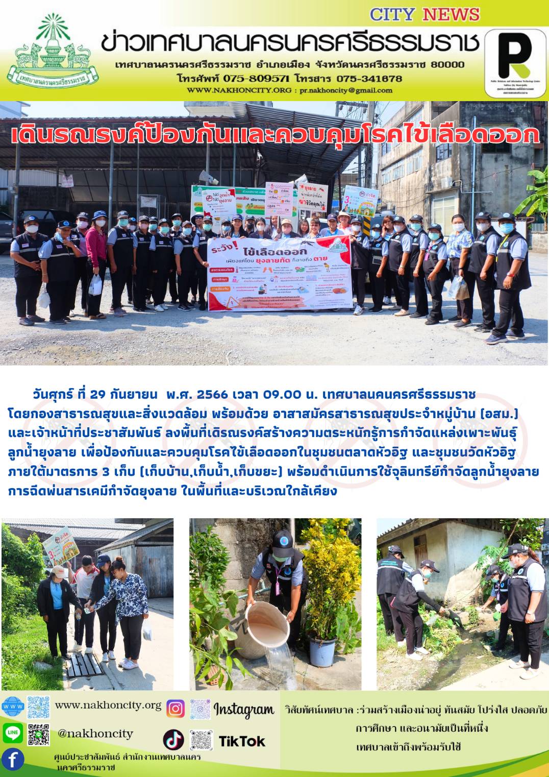 | เทศบาลนครนครศรีธรรมราช โดยกองสาธารณสุขและสิ่งแวดล้อม พร้อมด้วย อาสาสมัครสาธารณสุขประจำหมู่บ้าน (อสม.) ลงพื้นที่เดินรณรงค์ การป้องกันและควบคุมโรคไข้เลือดออก |