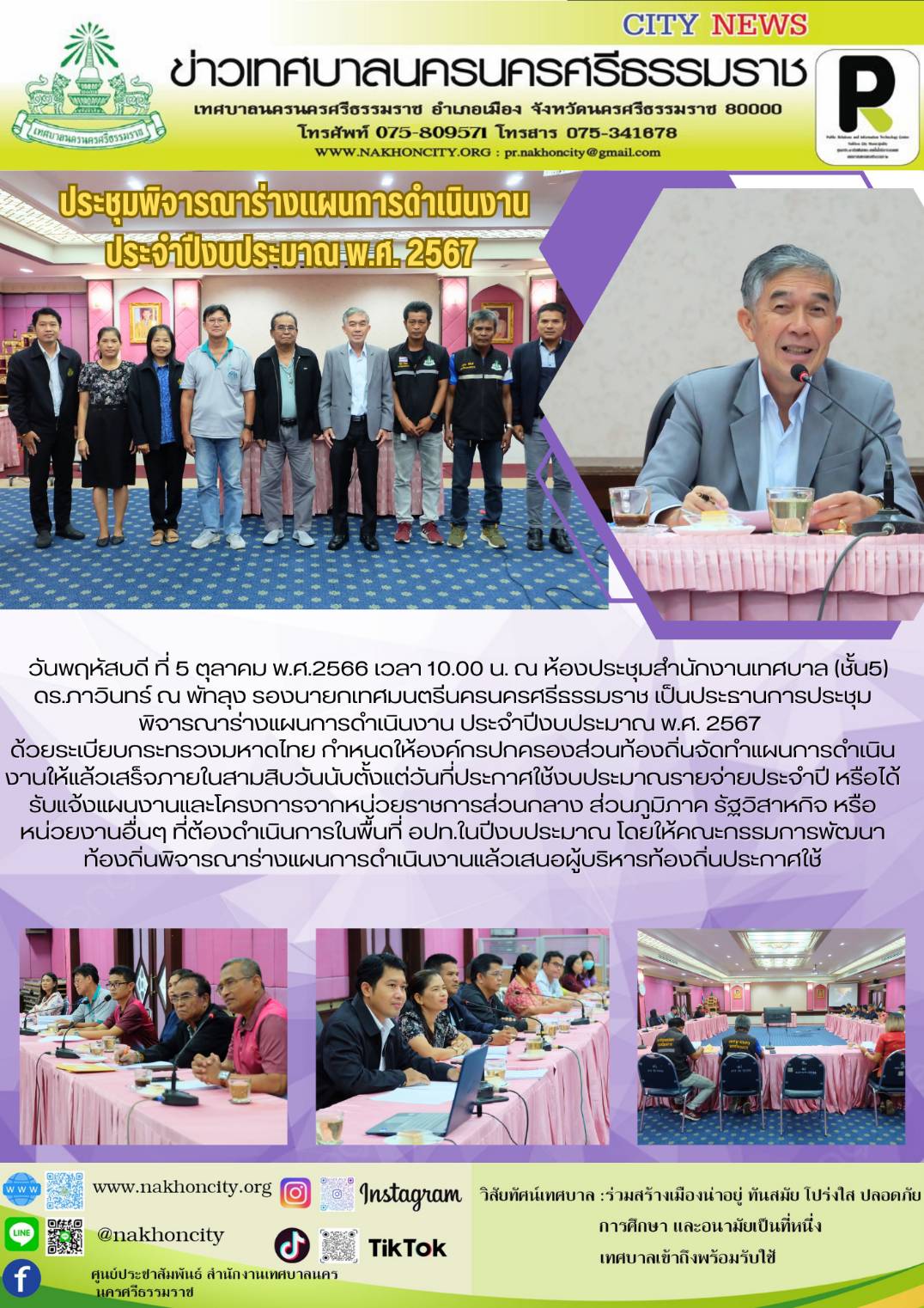 | ดร.ภาวินทร์ ณ พัทลุง รองนายกเทศมนตรีนครนครศรีธรรมราช เป็นประธานการประชุมพิจารณาร่างแผนการดำเนินงาน ประจำปีงบประมาณ พ.ศ. 2567 |