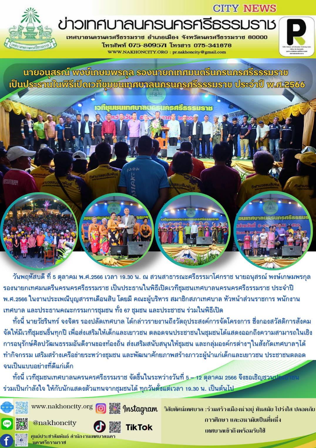 | นายอนุสรณ์ พงษ์เกษมพรกุล รองนายกเทศมนตรีนครนครศรีธรรมราช เป็นประธานในพิธีเปิดเวทีชุมชนเทศบาลนครนครศรีธรรมราช ประจำปี พ.ศ.2566 |