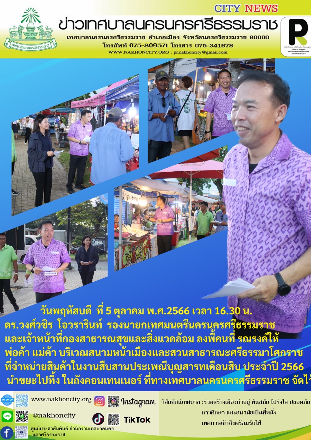 | ดร.วงศ์วชิร โอวรารินท์ รองนายกเทศมนตรีนครนครศรีธรรมราช และเจ้าหน้าที่กองสาธารณสุขและสิ่งแวดล้อม ลงพื้นที่ รณรงค์ให้ พ่อค้า แม่ค้า บริเวณสนามหน้าเมืองและสวน สาธารณะศรีธรรมาโศกราช ที่จำหน่ายสินค้าในงานสืบสานประเพณีบุญสารทเดือนสิบ ประจำปี 2566 นำขยะไปทิ้ง ในถังคอนเทนเนอร์ ที่ทางเทศบาลนครนครศรีธรรมราช จัดไว้ให้ |