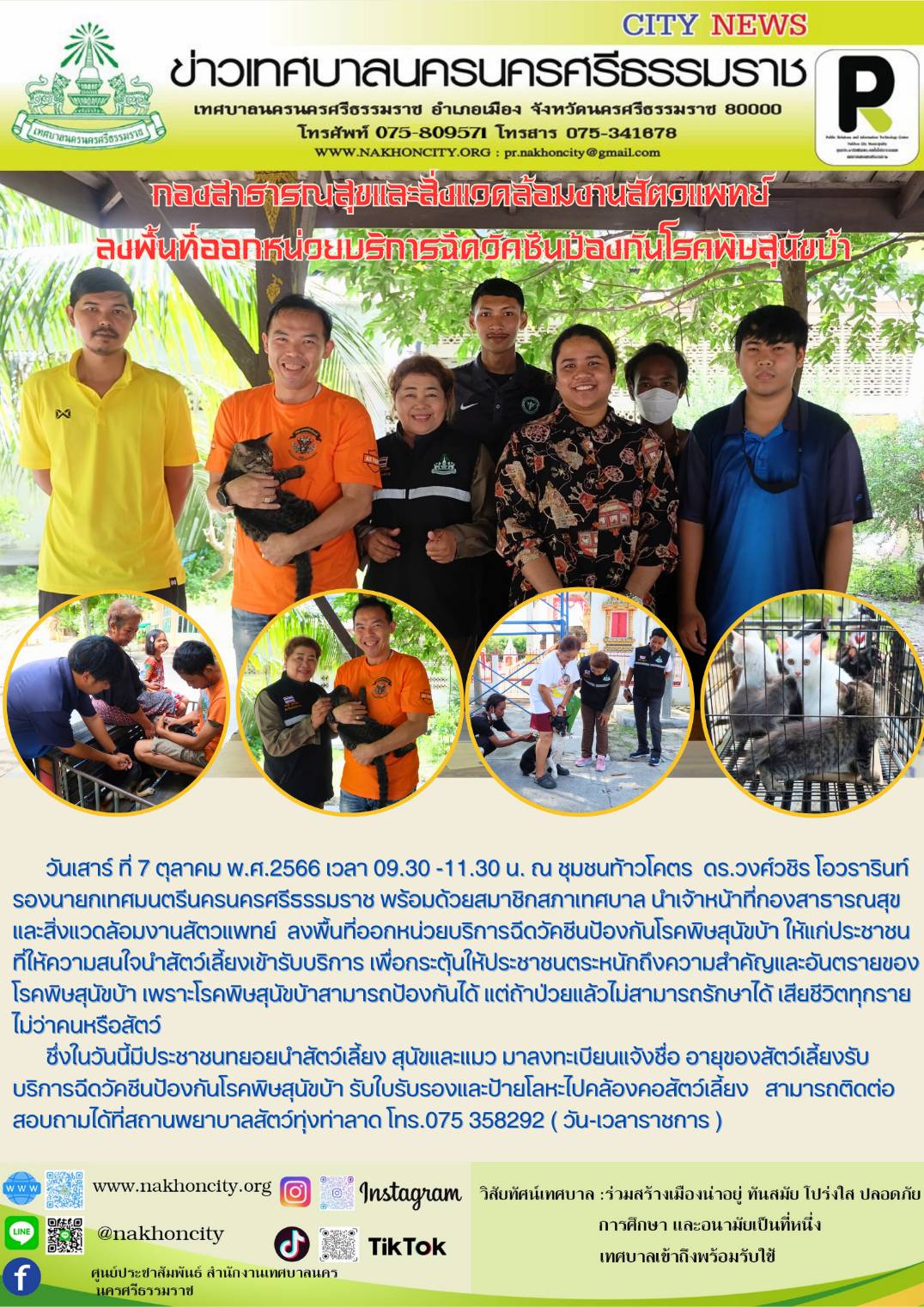 | วันเสาร์ ที่ 7 ตุลาคม พ.ศ.2566 เวลา 09.30 -11.30 น. ณ ชุมชนท้าวโคตร  ดร.วงศ์วชิร โอวรารินท์ รองนายกเทศมนตรีนครนครศรีธรรมราช พร้อมด้วยสมาชิกสภาเทศบาล นำเจ้าหน้าที่กองสาธารณสุขและสิ่งแวดล้อมงานสัตวแพทย์  ลงพื้นที่ออกหน่วยบริการฉีดวัคซีนป้องกันโรคพิษสุนัขบ้า ให้แก่ประชาชนที่ให้ความสนใจนำสัตว์เลี้ยงเข้ารับบริการ เพื่อกระตุ้นให้ประชาชนตระหนักถึงความสำคัญและอันตรายของโรคพิษสุนัขบ้า เพราะโรคพิษสุนัขบ้าสามารถป้องกันได้ แต่ถ้าป่วยแล้วไม่สามารถรักษาได้ เสียชีวิตทุกรายไม่ว่าคนหรือสัตว์ |