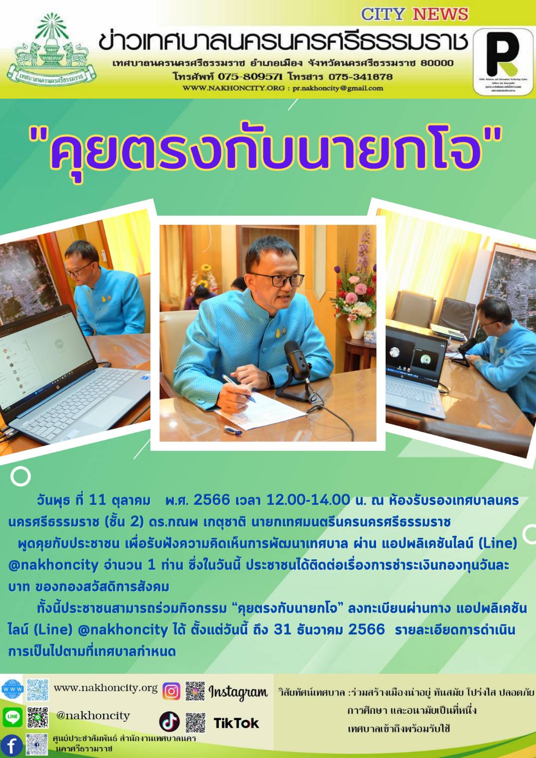 | ดร.กณพ เกตุชาติ นายกเทศมนตรีนครนครศรีธรรมราช พูดคุยกับประชาชน เพื่อรับฟังความคิดเห็นการพัฒนาเทศบาล ผ่าน แอปพลิเคชันไลน์ (Line) @nakhoncity |