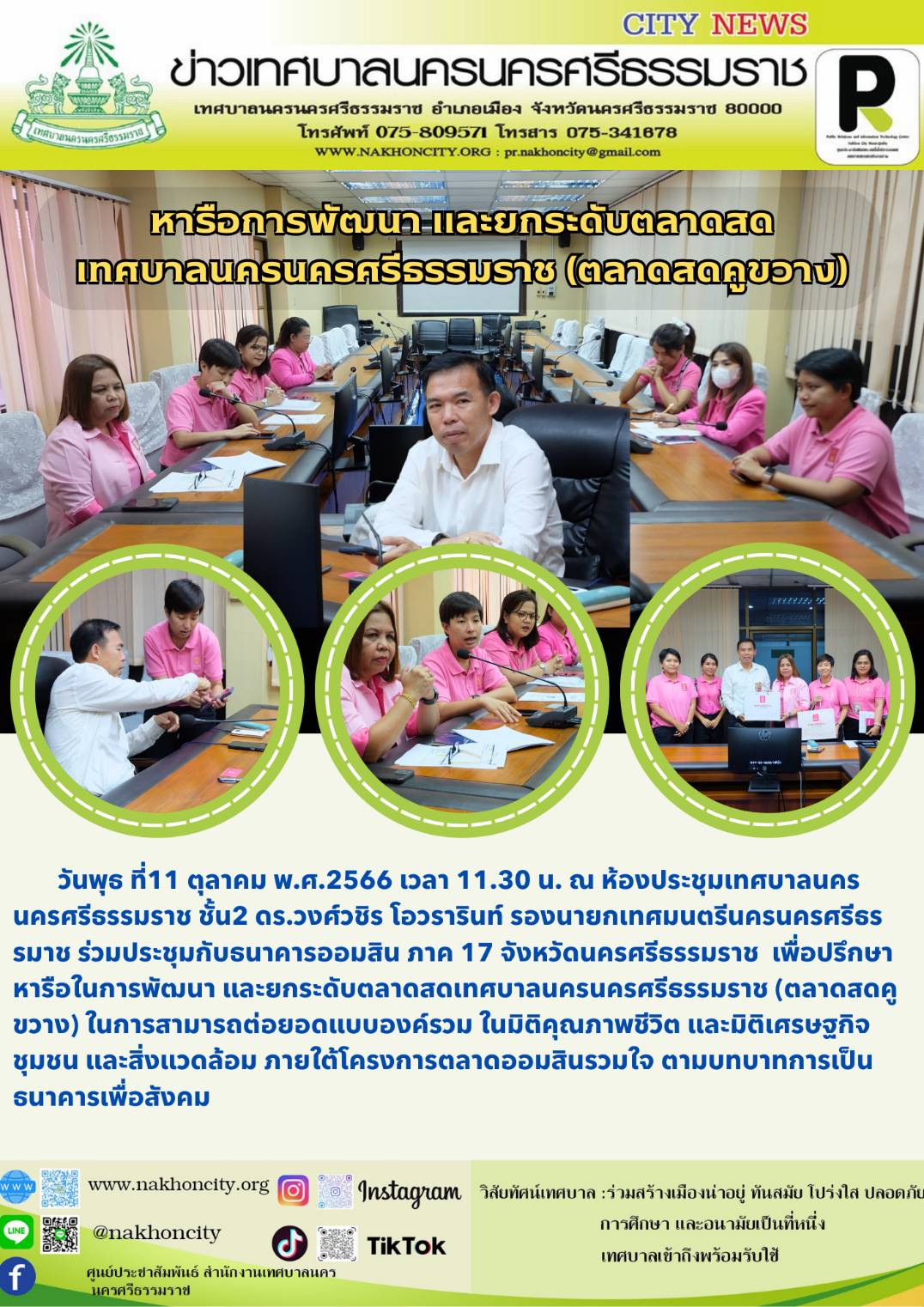| วันพุธ ที่11 ตุลาคม พ.ศ.2566 เวลา 11.30 น. ณ ห้องประชุมเทศบาลนครนครศรีธรรมราช ชั้น2 ดร.วงศ์วชิร โอวรารินท์ รองนายกเทศมนตรีนครนครศรีธรรมาช ร่วมประชุมกับธนาคารออมสิน ภาค 17 จังหวัดนครศรีธรรมราช เพื่อปรึกษาหารือในการพัฒนา และยกระดับตลาดสดเทศบาลนครนครศรีธรรมราช (ตลาดสดคูขวาง) ในการสามารถต่อยอดแบบองค์รวม ในมิติคุณภาพชีวิต และมิติเศรษฐกิจ ชุมชน และสิ่งแวดล้อม ภายใต้โครงการตลาดออมสินรวมใจ ตามบทบาทการเป็นธนาคารเพื่อสังคม …………. ภาพ//ข่าว//จันทร์จิรา |