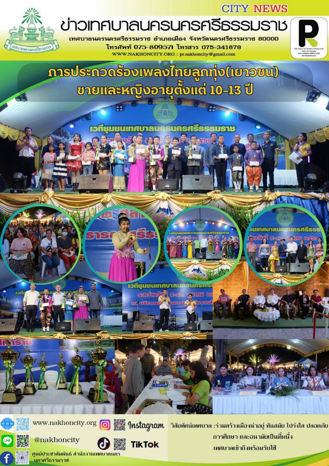 | วันพุธ ที่ 11 ตุลาคม พ.ศ.2566 เวลา 19.30 น. ณ สวนสาธารณะศรีธรรมาโศกราช เทศบาลนครนครศรีธรรมราช จัดกิจกรรมเวทีชุมชนเทศบาลนครนครศรีธรรมราช ประจำปี พ.ศ.2566 ในงานประเพณีบุญสารทเดือนสิบ เพื่อส่งเสริมให้เด็กและเยาวชน ตลอดจนประชาชนในชุมชนได้แสดงออกถึงความสามารถในเชิงการอนุรักษ์ศิลปวัฒนธรรมอันดีงานของท้องถิ่น ส่งเสริมสนับสนุนให้ชุมชน และกลุ่มองค์กรต่างๆในสังกัดเทศบาลฯได้ทำกิจกรรม เสริมสร้างเครือข่ายระหว่างชุมชน และพัฒนาศักยภาพสร้างภาวะผู้นำแก่เด็กและเยาวชน ประชาชนตลอดจนเป็นแบบอย่างที่ดีแก่เด็ก สำหรับในคืนนี้เป็นการประกวดร้องเพลงไทยลูกทุ่ง(เยาวชน) ประเภทชายและหญิง อายุตั้งแต่ 10 -13 ปี ผลการประกวดร้องเพลงไทยลูกทุ่ง (เยาวชนหญิง) ได้แก่
