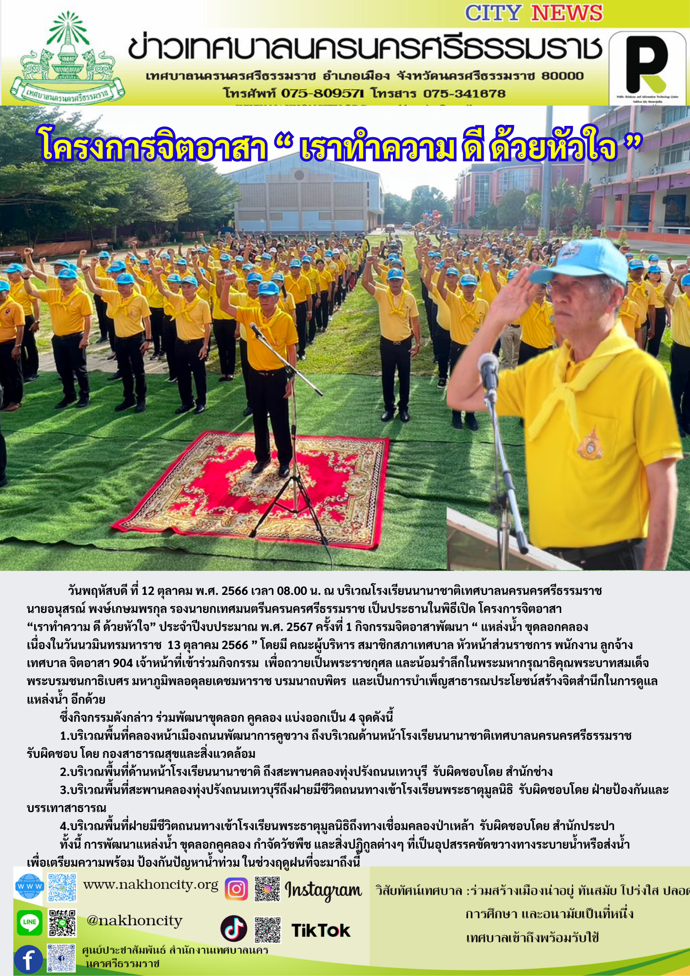 | นายอนุสรณ์ พงษ์เกษมพรกุล รองนายกเทศมนตรีนครนครศรีธรรมราช เป็นประธานในพิธีเปิด โครงการจิตอาสา “เราทำความ ดี ด้วยหัวใจ” ประจำปีงบประมาณ พ.ศ. 2567 ครั้งที่ 1 กิจกรรมจิตอาสาพัฒนา “ แหล่งน้ำ ขุดลอกคลอง เนื่องในวันนวมินทรมหาราช 13 ตุลาคม 2566 ” |