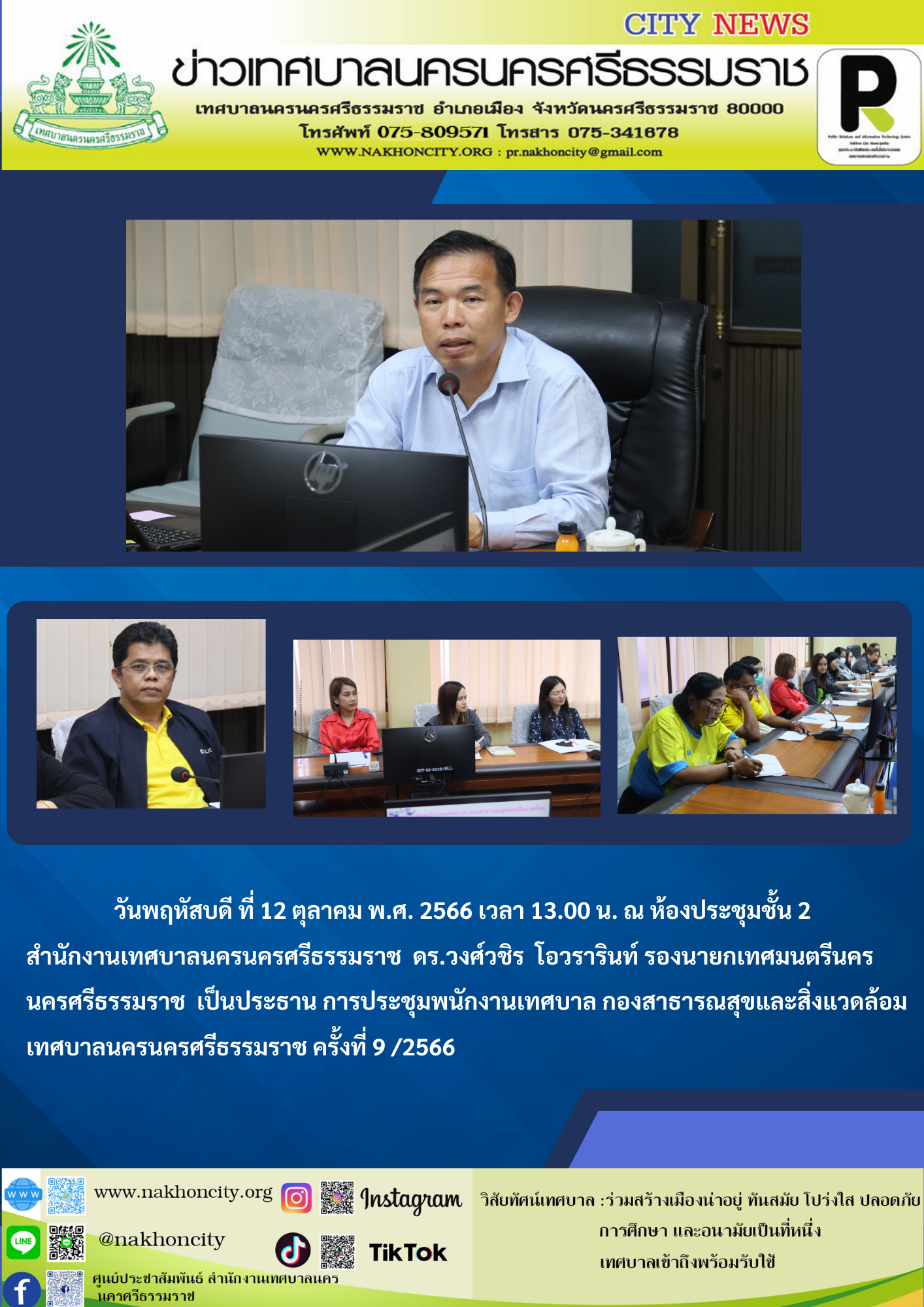 | ดร.วงศ์วชิร โอวรารินท์ รองนายกเทศมนตรีนครนครศรีธรรมราช เป็นประธาน การประชุมพนักงานเทศบาล กองสาธารณสุขและสิ่งแวดล้อมเทศบาลนครนครศรีธรรมราช ครั้งที่ 9 /2566 |