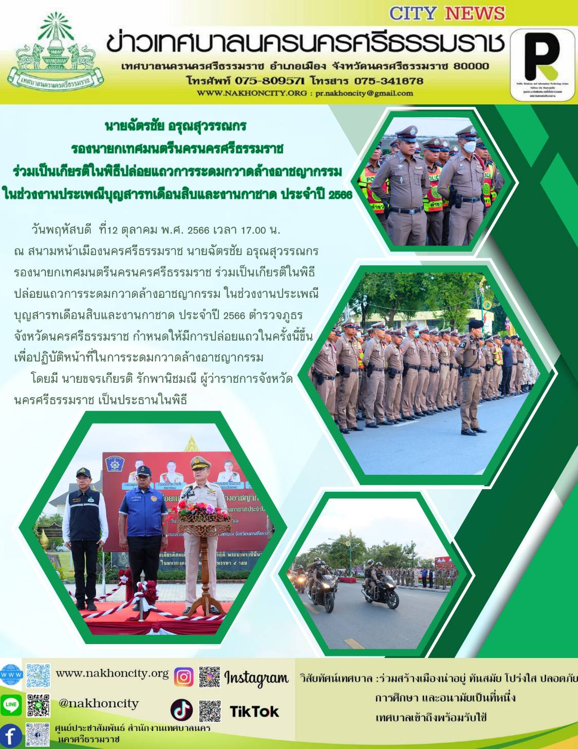 | วันพฤหัสบดี  ที่12 ตุลาคม พ.ศ. 2566 เวลา 17.00 น. ณ สนามหน้าเมืองนครศรีธรรมราช นายฉัตรชัย อรุณสุวรรณกร รองนายกเทศมนตรีนครนครศรีธรรมราช ร่วมเป็นเกียรติในพิธีปล่อยแถวการระดมกวาดล้างอาชญากรรม ในช่วงงานประเพณีบุญสารทเดือนสิบและงานกาชาด ประจำปี 2566 ตำรวจภูธรจังหวัดนครศรีธรรมราช กำหนดให้มีการปล่อยแถวในครั้งนี้ขึ้น เพื่อปฏิบัติหน้าที่ในการระดมกวาดล้างอาชญากรรม |