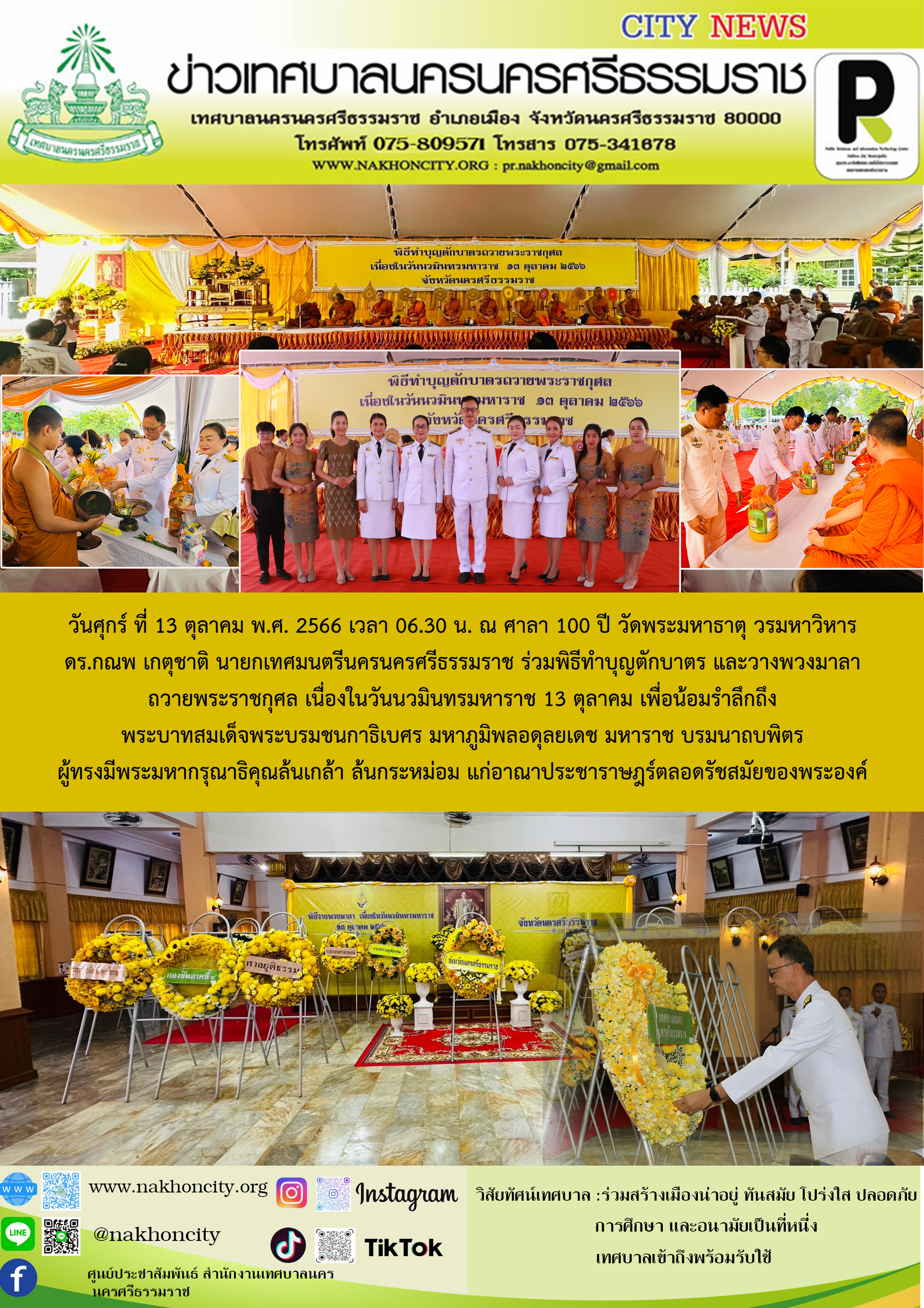 | ดร.กณพ เกตุชาติ นายกเทศมนตรีนครนครศรีธรรมราช ร่วมพิธีทำบุญตักบาตร และวางพวงมาลาถวายพระราชกุศล เนื่องในวันนวมินทรมหาราช 13 ตุลาคม |