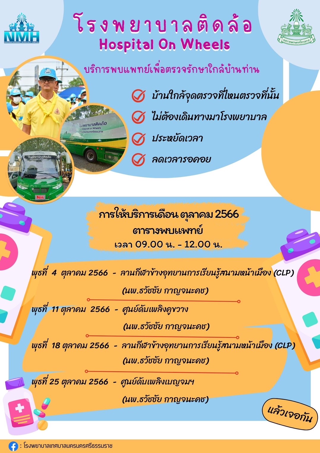 | เทศบาลนครนครศรีธรรมราช  โดยโรงพยาบาลเทศบาลนครนครศรีธรรมราช กองการแพทย์   ดำเนินโครงการโรงพยาบาลติดล้อหมอถึงหน้าบ้าน ซึ่งในเดือนตุลาคม 2566 มีกำหนดลงพื้นที่บริการให้บริการดังนี้ ข่าว//ไกรสิทธิ |