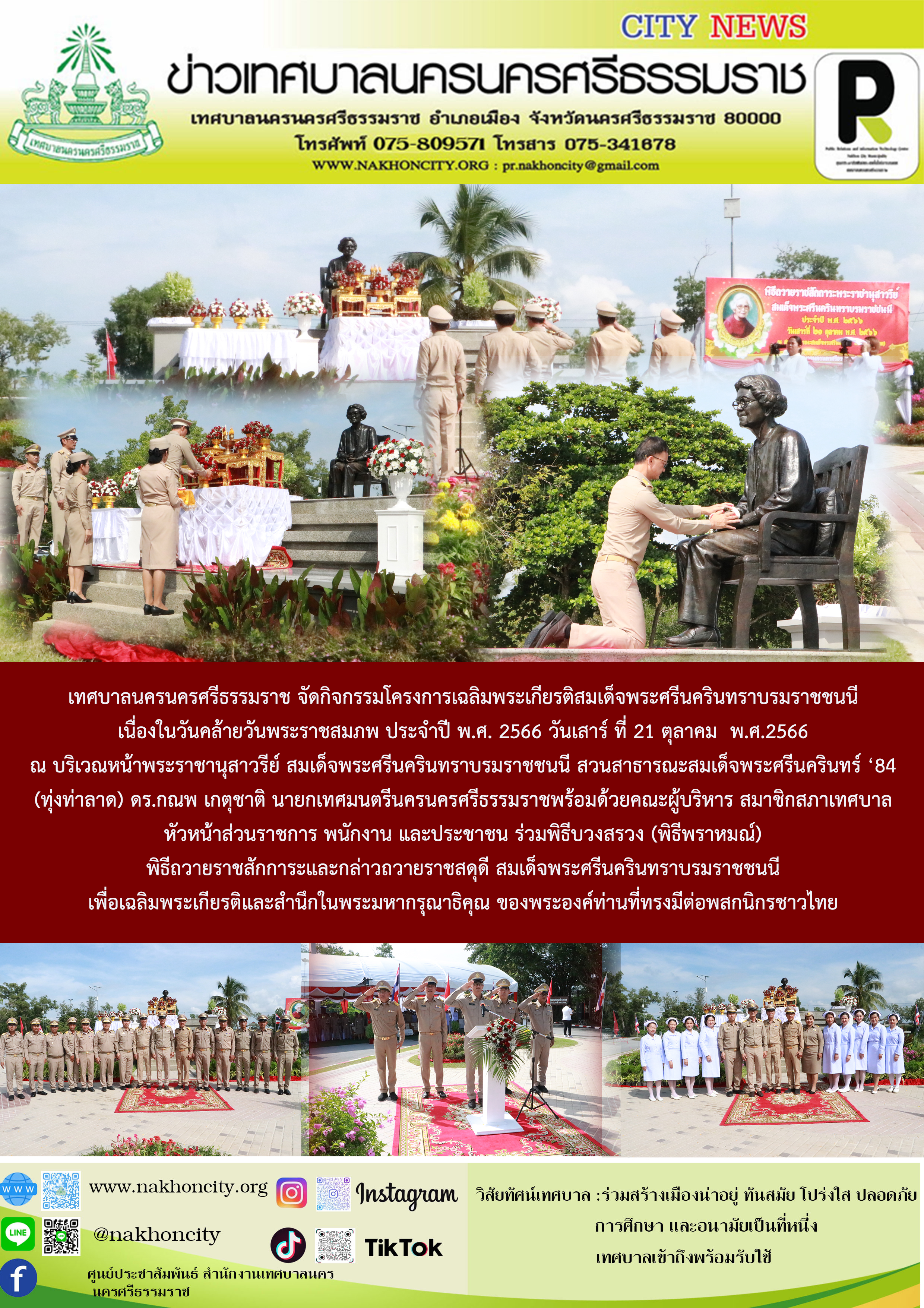 | เทศบาลนครนครศรีธรรมราช จัดกิจกรรมโครงการ เฉลิมพระเกียรติสมเด็จพระศรีนครินทราบรมราชชนนี เนื่องในวันคล้ายวันพระราชสมภพ ประจำปี พ.ศ. 2566 วันเสาร์ ที่ 21 ตุลาคม พ.ศ.2566 ณ บริเวณหน้าพระราชานุสาวรีย์ สมเด็จพระศรีนครินทราบรมราชชนนี สวนสาธารณะสมเด็จพระศรีนครินทร์ ‘84 (ทุ่งท่าลาด) ดร.กณพ เกตุชาติ นายกเทศมนตรีนครนครศรีธรรมราชพร้อมด้วยคณะผู้บริหาร สมาชิกสภาเทศบาล หัวหน้าส่วนราชการ พนักงาน และประชาชน ร่วมพิธีบวงสรวง (พิธีพราหมณ์) พิธีถวายราชสักการะและกล่าวถวายราชสดุดี สมเด็จพระศรีนครินทราบรมราชชนนี เพื่อเฉลิมพระเกียรติและสำนึกในพระมหากรุณาธิคุณของพระองค์ท่านที่ทรงมีต่อพสกนิกรชาวไทย