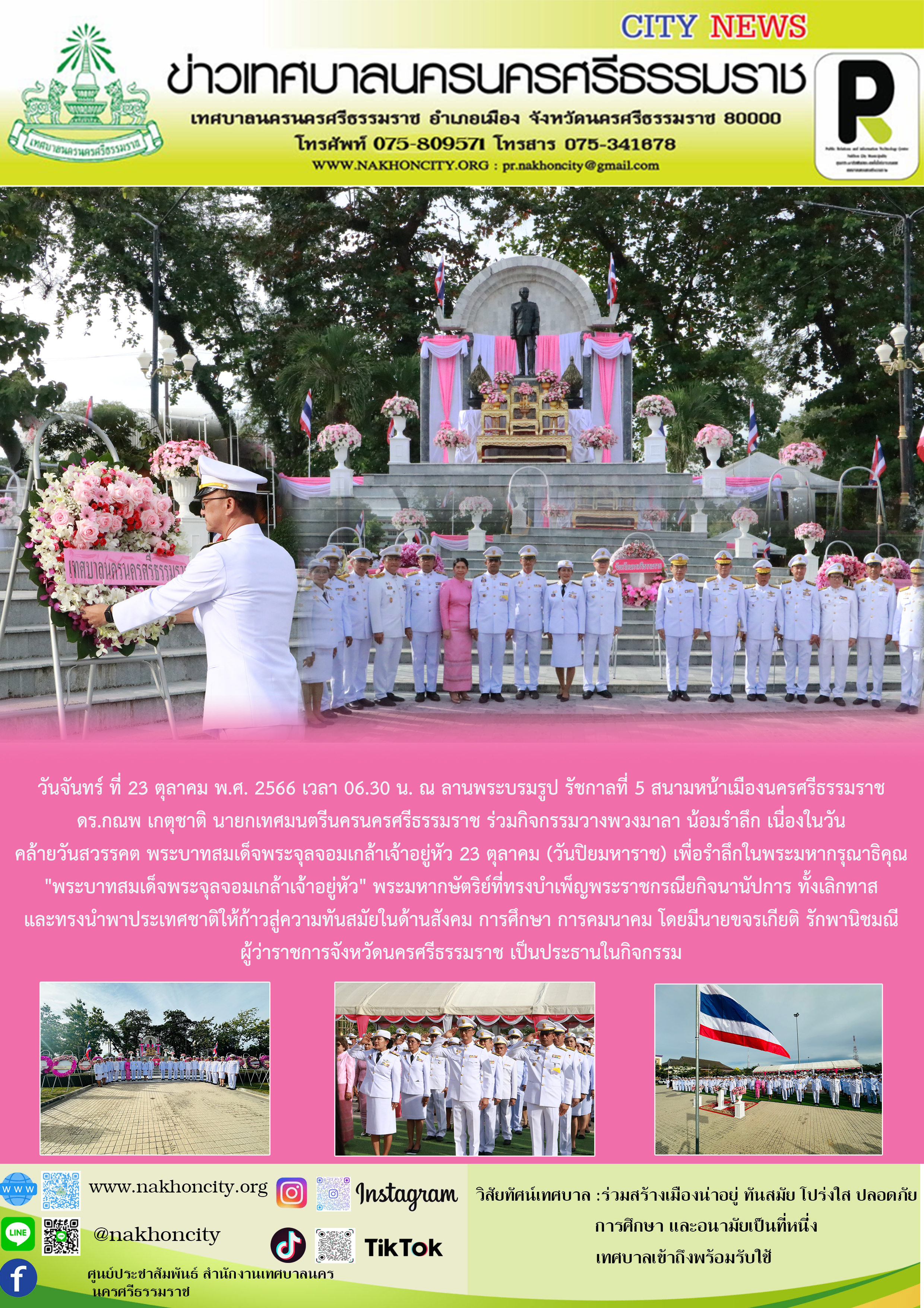| ดร.กณพ เกตุชาติ นายกเทศมนตรีนครนครศรีธรรมราช ร่วมกิจกรรมวางพวงมาลา น้อมรําลึก เนื่องในวันคล้ายวันสวรรคต พระบาทสมเด็จพระจุลจอมเกล้าเจ้าอยู่หัว 23 ตุลาคม (วันปิยมหาราช) |