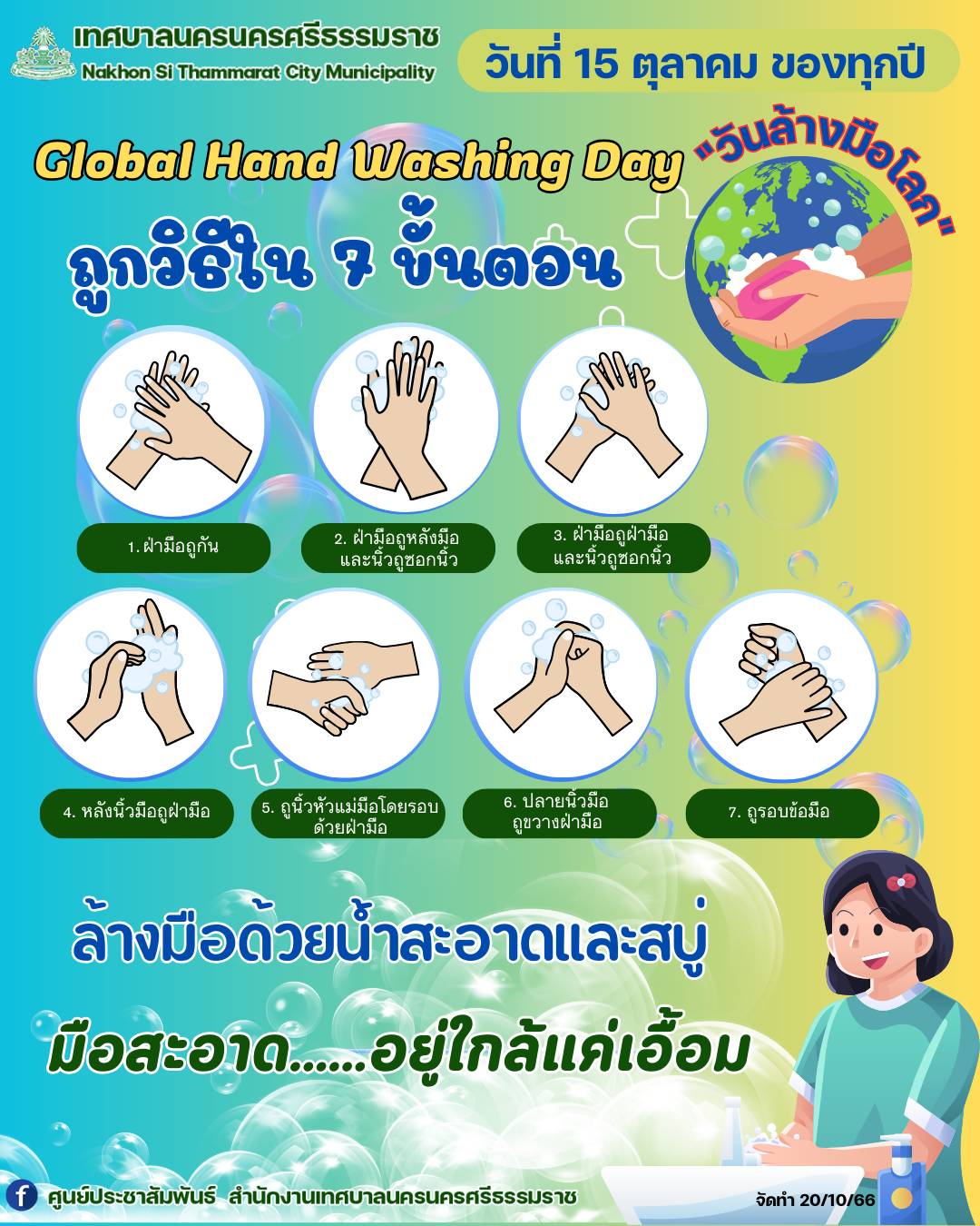 | 15 ตุลาคม ของทุกปี รณรงค์วันล้างมือโลก (Global Hand Washing Day) เพื่อส่งเสริมให้ประชาชนเรียนรู้การล้างมือที่ถูกต้อง สร้างสุขอนามัยที่ดี ส่งเสริม สนับสนุน ให้ประชาชนและสถานบริการสาธารณสุขทุกแห่งให้ความสำคัญในเรื่องการล้างมือด้วยน้ำสะอาดและสบู่ 7 ขั้นตอน เพื่อสร้างความตระหนักให้เกิดการปฏิบัติอย่างเป็นรูปธรรม ปรับเปลี่ยนพฤติกรรมอนามัยการล้างมือที่ถูกต้องจนเกิดเป็นนิสัยการรักสุขภาพ และหยุดการแพร่กระจายของเชื้อโรค |