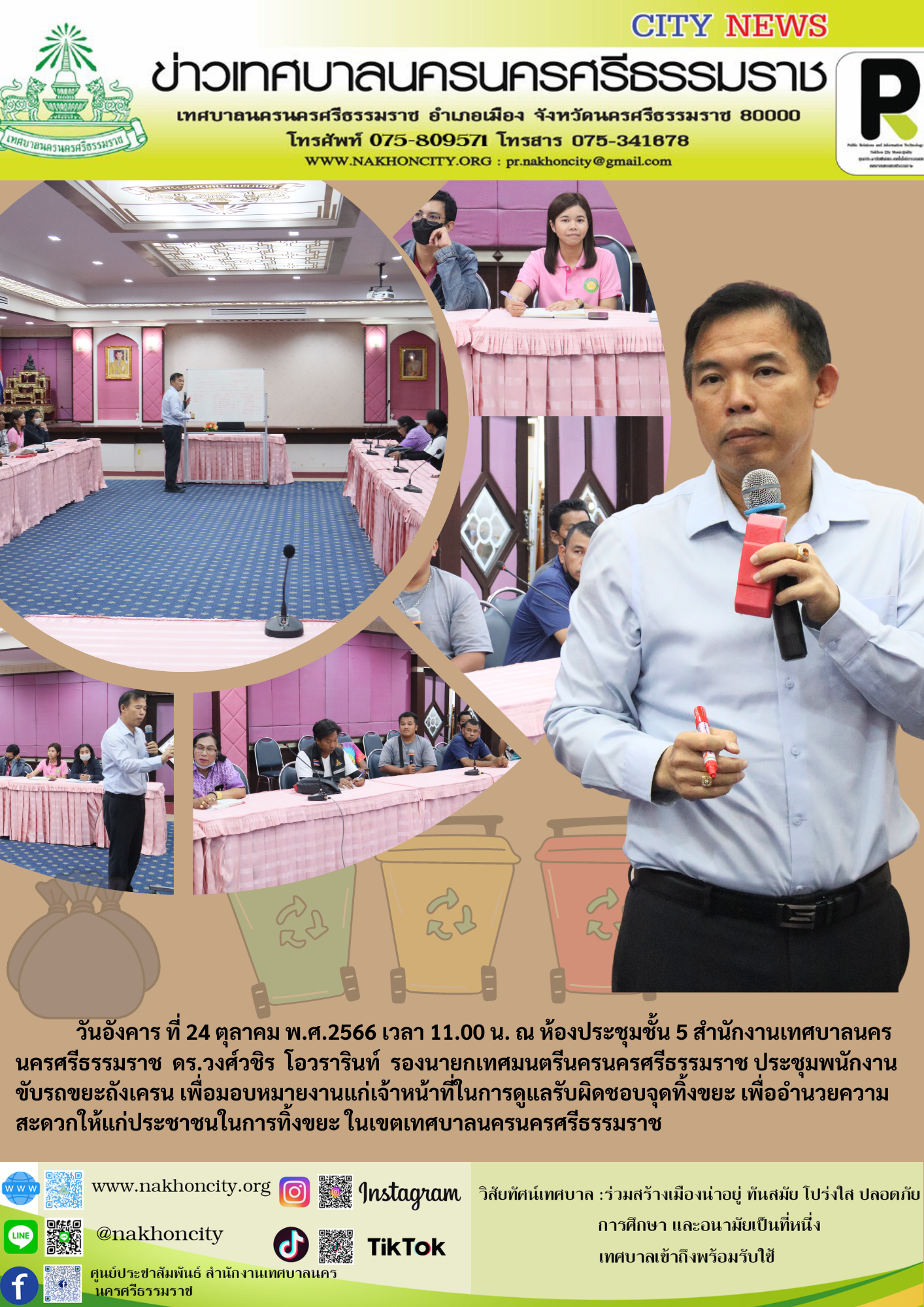 | วันอังคาร ที่ 24 ตุลาคม พ.ศ.2566 เวลา 11.00 น. ณ ห้องประชุมชั้น 5 สำนักงานเทศบาลนครนครศรีธรรมราช ดร.วงศ์วชิร โอวรารินท์ รองนายกเทศมนตรีนครนครศรีธรรมราช ประชุมพนักงาน ขับรถขยะถังเครน เพื่อมอบหมายงานแก่เจ้าหน้าที่ในการดูแลรับผิดชอบจุดทิ้งขยะ เพื่ออำนวยความสะดวกให้แก่ประชาชนในการทิ้งขยะ ในเขตเทศบาลนครนครศรีธรรมราช |