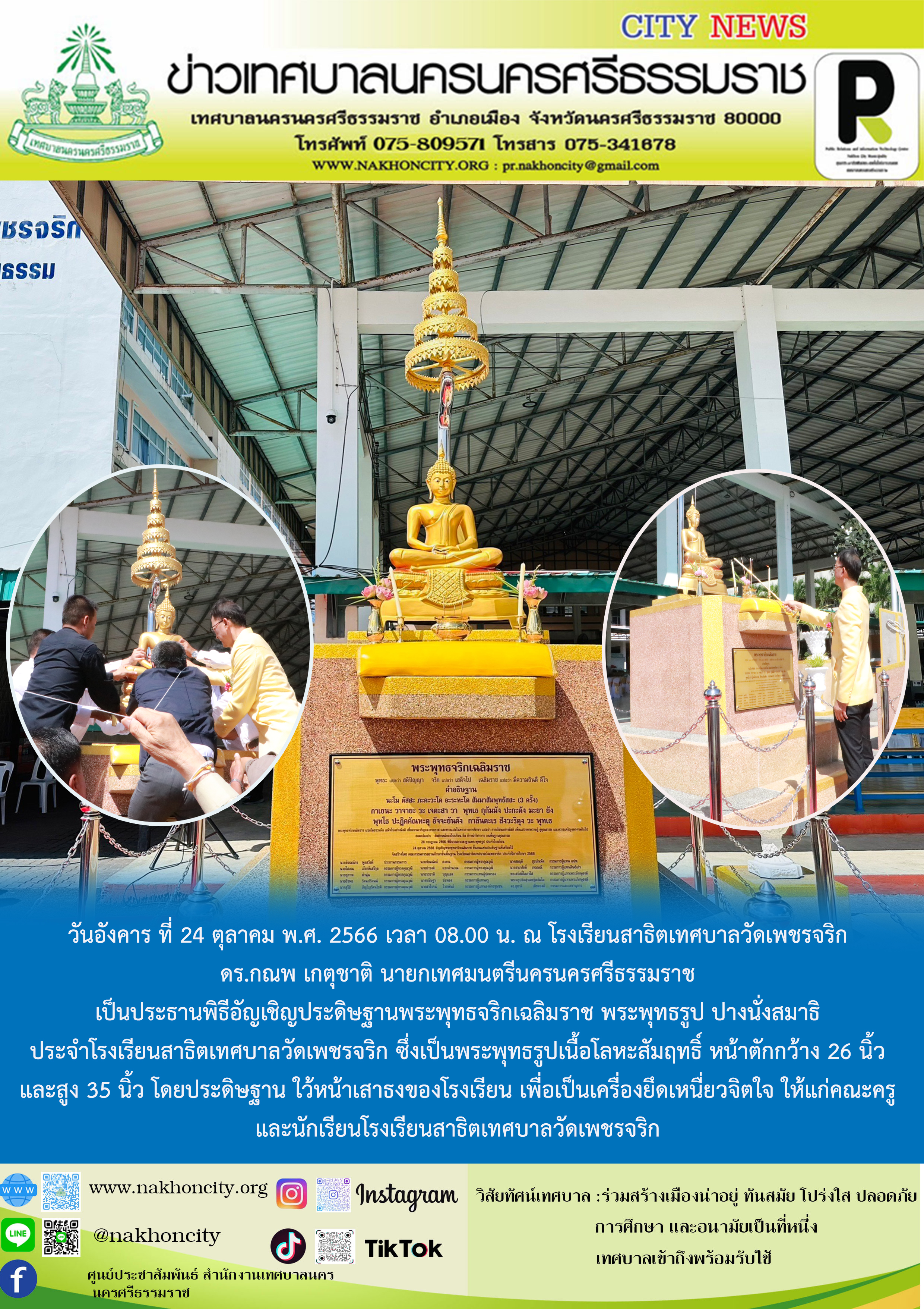 | ดร.กณพ เกตุชาติ นายกเทศมนตรีนครนครศรีธรรมราชเป็นประธานพิธีอัญเชิญประดิษฐานพระพุทธจริกเฉลิมราช พระพุทธรูป ปางนั่งสมาธิ ประจำโรงเรียนสาธิตเทศบาลวัดเพชรจริก ซึ่งเป็นพระพุทธรูปเนื้อโลหะสัมฤทธิ์ หน้าตักกว้าง 26 นิ้ว และสูง 35 นิ้ว โดยประดิษฐาน ใว้หน้าเสาธงของโรงเรียน |