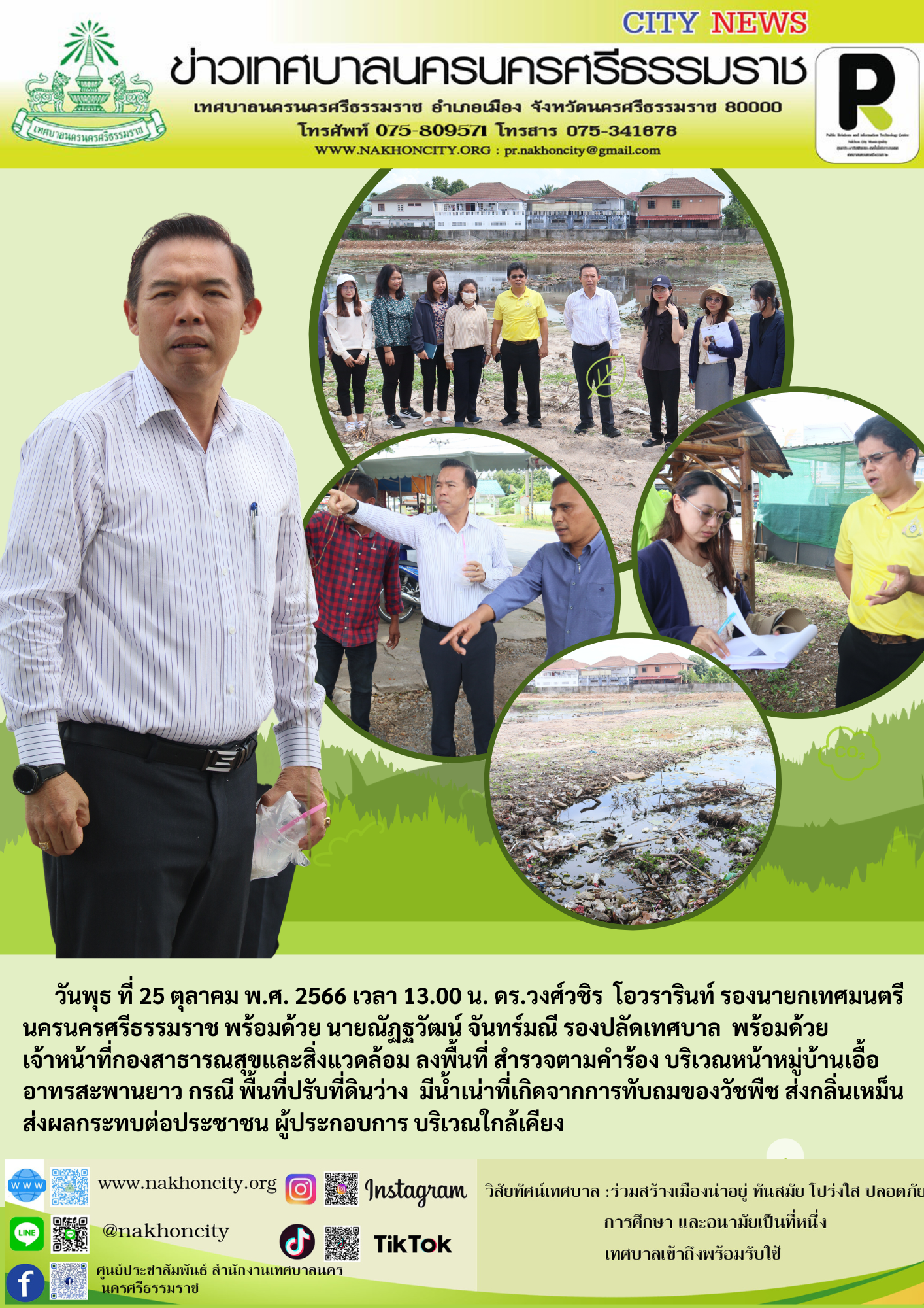 | วันพุธ ที่ 25 ตุลาคม พ.ศ. 2566 เวลา 13.00 น. ดร.วงศ์วชิร โอวรารินท์ รองนายกเทศมนตรีนครนครศรีธรรมราช พร้อมด้วย นายณัฏฐวัฒน์ จันทร์มณี รองปลัดเทศบาล พร้อมด้วยเจ้าหน้าที่กองสาธารณสุขและสิ่งแวดล้อม ลงพื้นที่ สำรวจตามคำร้อง บริเวณหน้าหมู่บ้านเอื้ออาทรสะพานยาว กรณี พื้นที่ปรับที่ดินว่าง มีน้ำเน่าที่เกิดจากการทับถมของวัชพืช ส่งกลิ่นเหม็น ส่งผลกระทบต่อประชาชน ผู้ประกอบการ บริเวณใกล้เคียง