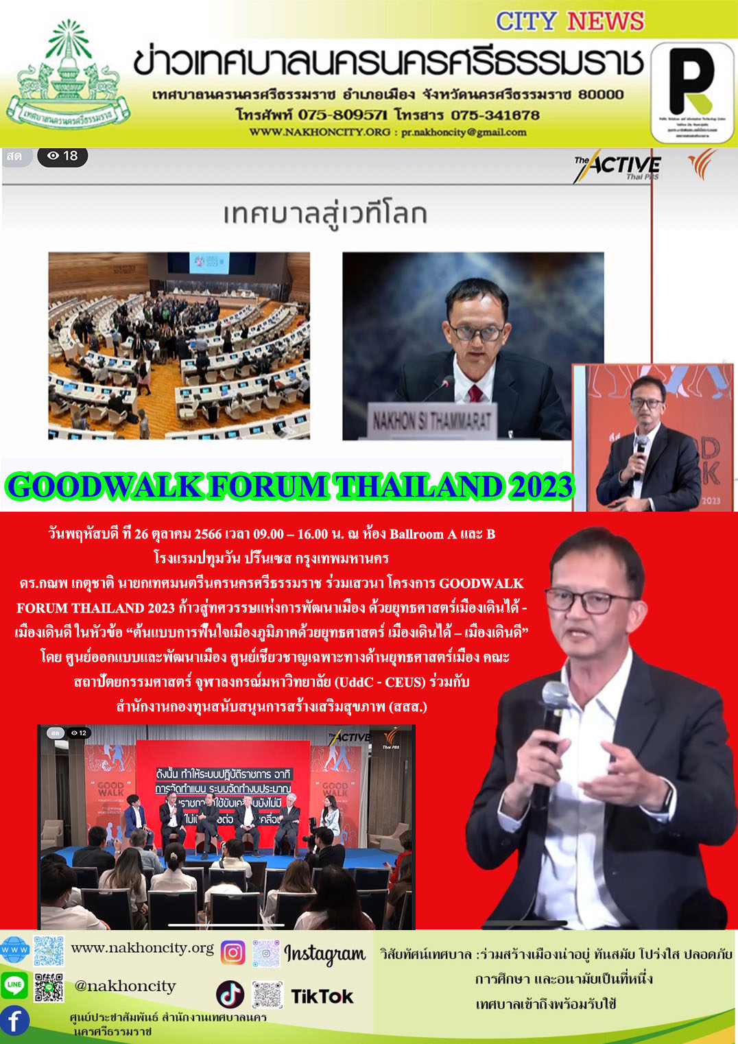 | ดร.กณพ เกตุชาติ นายกเทศมนตรีนครนครศรีธรรมราช ร่วมเสวนา โครงการ GOODWALK FORUM THAILAND 2023 ก้าวสู่ทศวรรษแห่งการพัฒนาเมือง ด้วยยุทธศาสตร์เมืองเดินได้ - เมืองเดินดี |