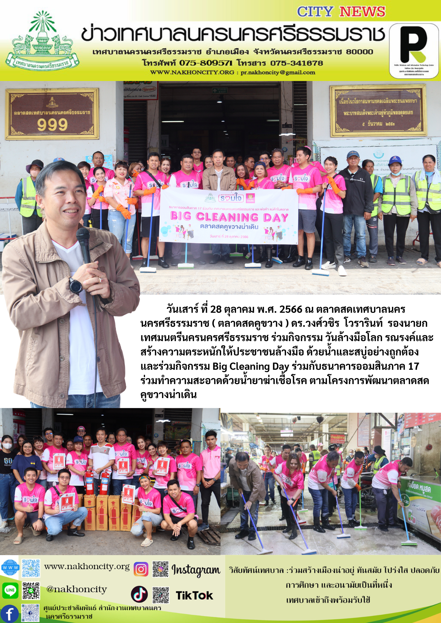 | วันเสาร์ ที่ 28 ตุลาคม พ.ศ. 2566 ณ ตลาดสดเทศบาลนครนครศรีธรรมราช ( ตลาดสดคูขวาง ) ดร.วงศ์วชิร โวรารินท์ รองนายกเทศมนตรีนครนครศรีธรรมราช ร่วมกิจกรรม วันล้างมือโลก รณรงค์และสร้างความตระหนักให้ประชาชนล้างมือ ด้วยน้ำและสบู่อย่างถูกต้อง และร่วมกิจกรรม Big Cleaning Day ร่วมกับธนาคารออมสินภาค 17 ร่วมทำความสะอาดด้วยน้ำยาฆ่าเชื้อโรค ตามโครงการพัฒนาตลาดสดคูขวางน่าเดิน |