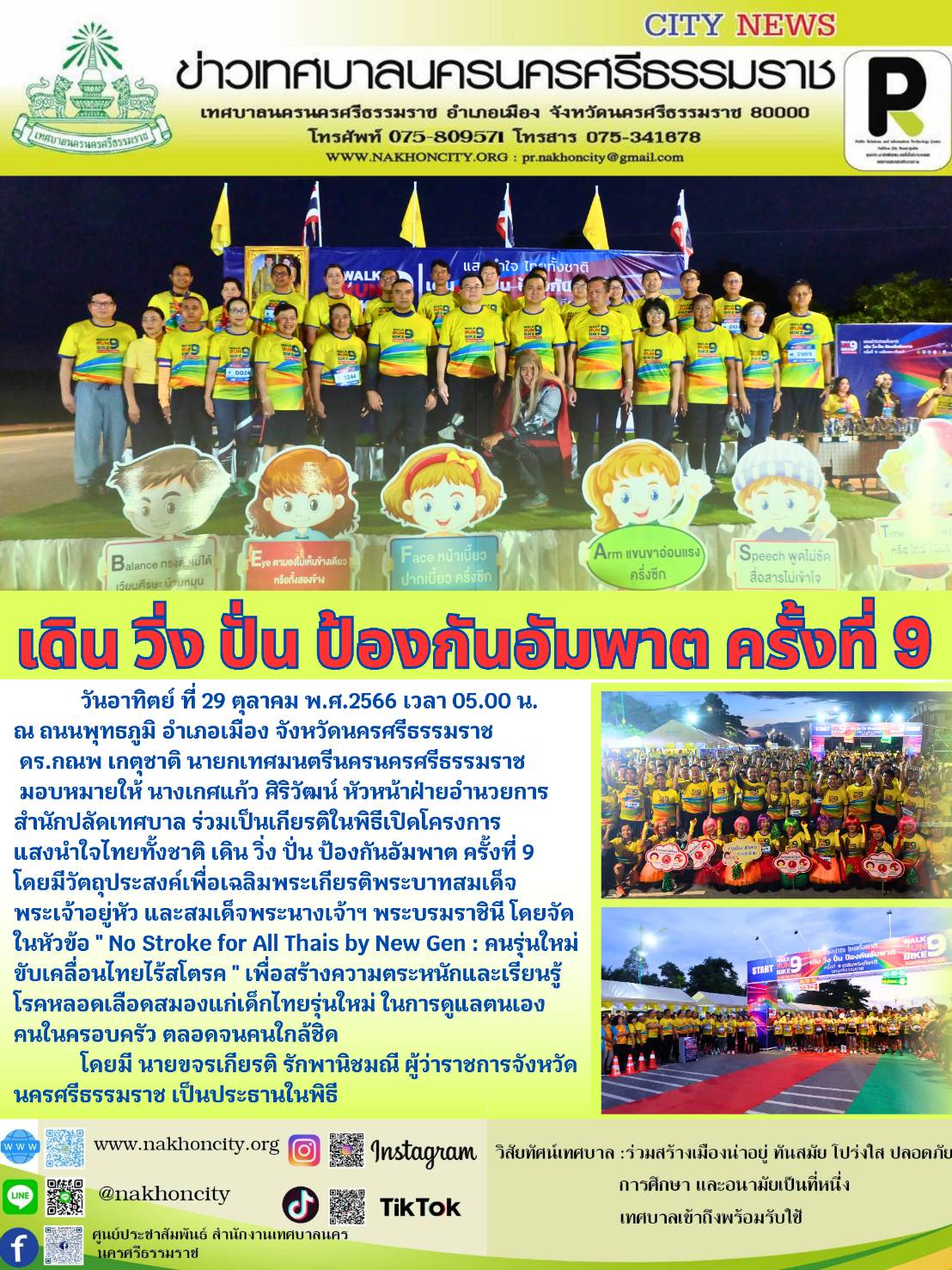 | วันอาทิตย์ ที่ 29 ตุลาคม พ.ศ.2566 เวลา 05.00 น.ณ ถนนพุทธภูมิ อำเภอเมือง จังหวัดนครศรีธรรมราช ดร.กณพ เกตุชาติ นายกเทศมนตรีนครนครศรีธรรมราช มอบหมายให้ นางเกศแก้ว ศิริวัฒน์ หัวหน้าฝ่ายอำนวยการ สำนักปลัดเทศบาล ร่วมเป็นเกียรติในพิธีเปิดโครงการแสงนำใจไทยทั้งชาติ เดิน วิ่ง ปั่น ป้องกันอัมพาต ครั้งที่ 9 โดยมีวัตถุประสงค์เพื่อเฉลิมพระเกียรติพระบาทสมเด็จพระเจ้าอยู่หัว และสมเด็จพระนางเจ้าฯ พระบรมราชินี โดยจัดในหัวข้อ " No Stroke for All Thais by New Gen : คนรุ่นใหม่ ขับเคลื่อนไทยไร้สโตรค " เพื่อสร้างความตระหนักและเรียนรู้ โรคหลอดเลือดสมองแก่เด็กไทยรุ่นใหม่ ในการดูแลตนเอง คนในครอบครัว ตลอดจนคนใกล้ชิด |