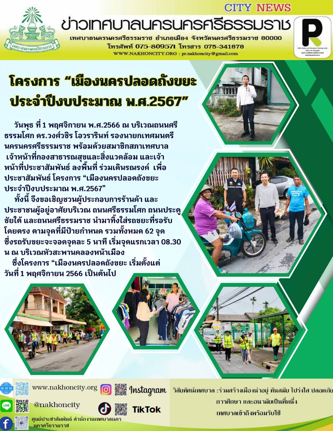 | ดร.วงศ์วชิร โอวรารินท์ รองนายกเทศมนตรีนครนครศรีธรรมราช พร้อมด้วยสมาชิกสภาเทศบาล เจ้าหน้าที่กองสาธารณสุขและสิ่งแวดล้อม และเจ้าหน้าที่ประชาสัมพันธ์ ลงพื้นที่ ร่วมเดินรณรงค์ เพื่อประชาสัมพันธ์ โครงการ “เมืองนครปลอดถังขยะ |
