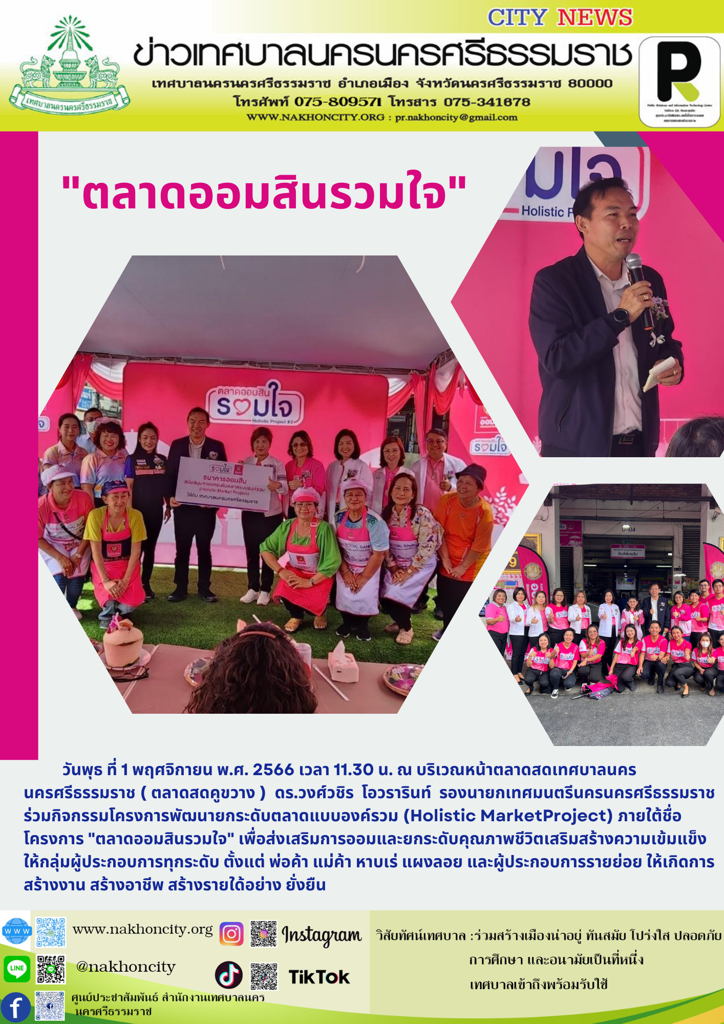 | วันพุธที่ 1 พฤศจิกายน พ.ศ. 2566 เวลา 11.30 น. ณ บริเวณหน้าตลาดสดเทศบาลนครนครศรีธรรมราช ( ตลาดสดคูขวาง ) ดร.วงศ์วชิร โอวรารินท์ รองนายกเทศมนตรีนครนครศรีธรรมราช ร่วมกิจกรรมโครงการพัฒนายกระดับตลาดแบบองค์รวม (Holistic MarketProject) ภายใต้ชื่อโครงการ "ตลาดออมสินรวมใจ" เพื่อส่งเสริมการออมและยกระดับคุณภาพชีวิตเสริมสร้างความเข้มแข็งให้กลุ่มผู้ประกอบการทุกระดับ ตั้งแต่ พ่อค้า แม่ค้า หาบเร่ แผงลอย และผู้ประกอบการรายย่อย ให้เกิดการสร้างงาน สร้างอาชีพ สร้างรายใด้อย่าง ยั่งยืน |