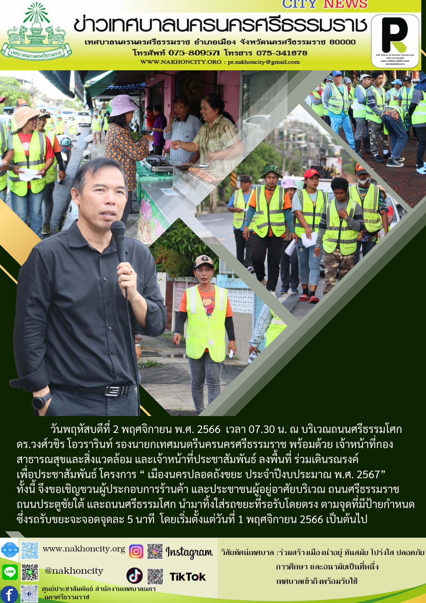| ดร.วงศ์วชิร โอวรารินท์ รองนายกเทศมนตรีนครนครศรีธรรมราช พร้อมด้วย เจ้าหน้าที่กองสาธารณสุขและสิ่งแวดล้อม และเจ้าหน้าที่ประชาสัมพันธ์ ลงพื้นที่ ร่วมเดินรณรงค์ เพื่อประชาสัมพันธ์ โครงการ “ เมืองนครปลอดถังขยะ ประจำปีงบประมาณ พ.ศ. 2567” |