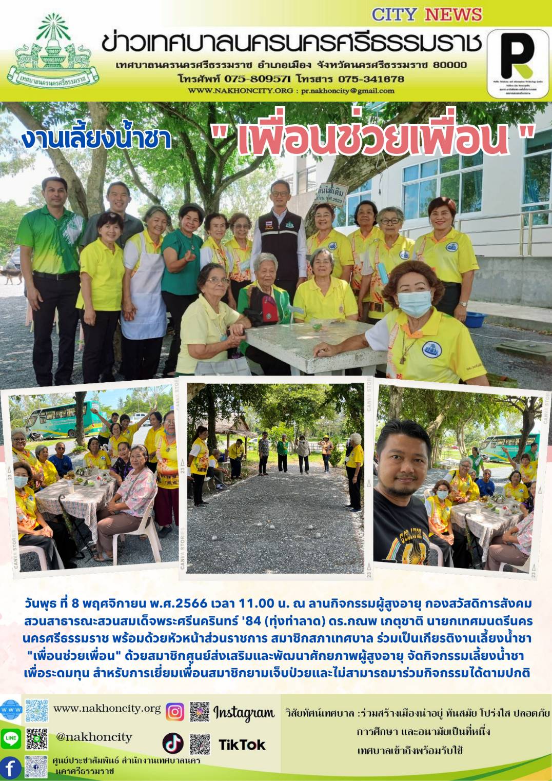 | วันพุธ ที่ 8 พฤศจิกายน พ.ศ.2566 เวลา 11.00 น. ณ ลานกิจกรรมผู้สูงอายุ กองสวัสดิการสังคม สวนสาธารณะสวนสมเด็จพระศรีนครินทร์ '84 (ทุ่งท่าลาด) ดร.กณพ เกตุชาติ นายกเทศมนตรีนครนครศรีธรรมราช พร้อมด้วยหัวหน้าส่วนราชการ สมาชิกสภาเทศบาล ร่วมเป็นเกียรติงานเลี้ยงน้ำชา "เพื่อนช่วยเพื่อน" ด้วยสมาชิกศูนย์ส่งเสริมและพัฒนาศักยภาพผู้สูงอายุ จัดกิจกรรมเลี้ยงน้ำชา เพื่อระดมทุน สำหรับการเยี่ยมเพื่อนสมาชิกยามเจ็บป่วยและไม่สามารถมาร่วมกิจกรรมได้ตามปกติ  |