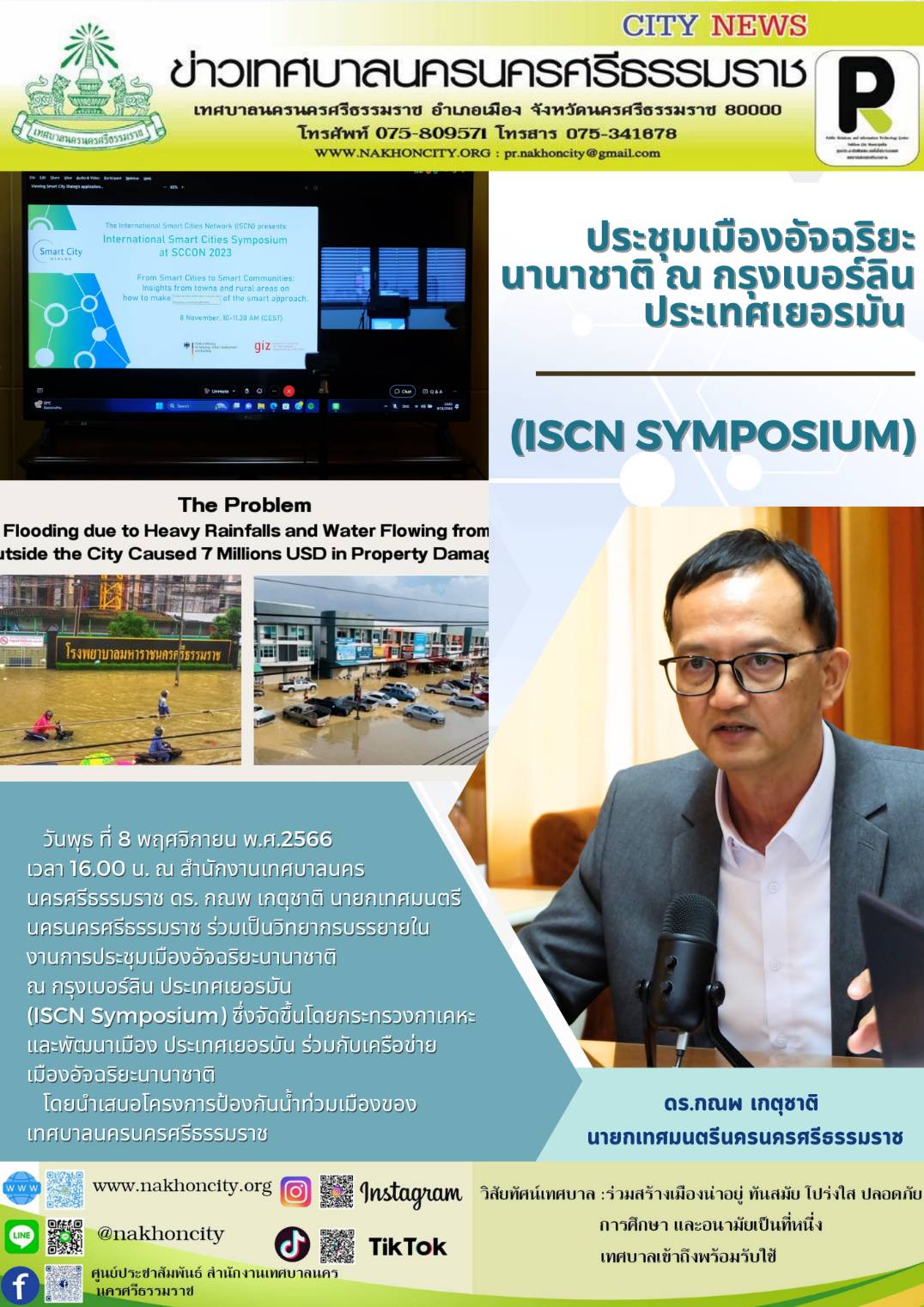 | วันพุธ ที่ 8 พฤศจิกายน พ.ศ.2566 เวลา 16.00 น. ณ สำนักงานเทศบาลนครนครศรีธรรมราช ดร. กณพ เกตุชาติ นายกเทศมนตรีนครนครศรีธรรมราช ร่วมเป็นวิทยากรบรรยายในงานการประชุมเมืองอัจฉริยะนานาชาติ ณ กรุงเบอร์ลิน ประเทศเยอรมัน (ISCN Symposium) ซึ่งจัดขึ้นโดยกระทรวงการเคหะและพัฒนาเมือง ประเทศเยอรมัน |