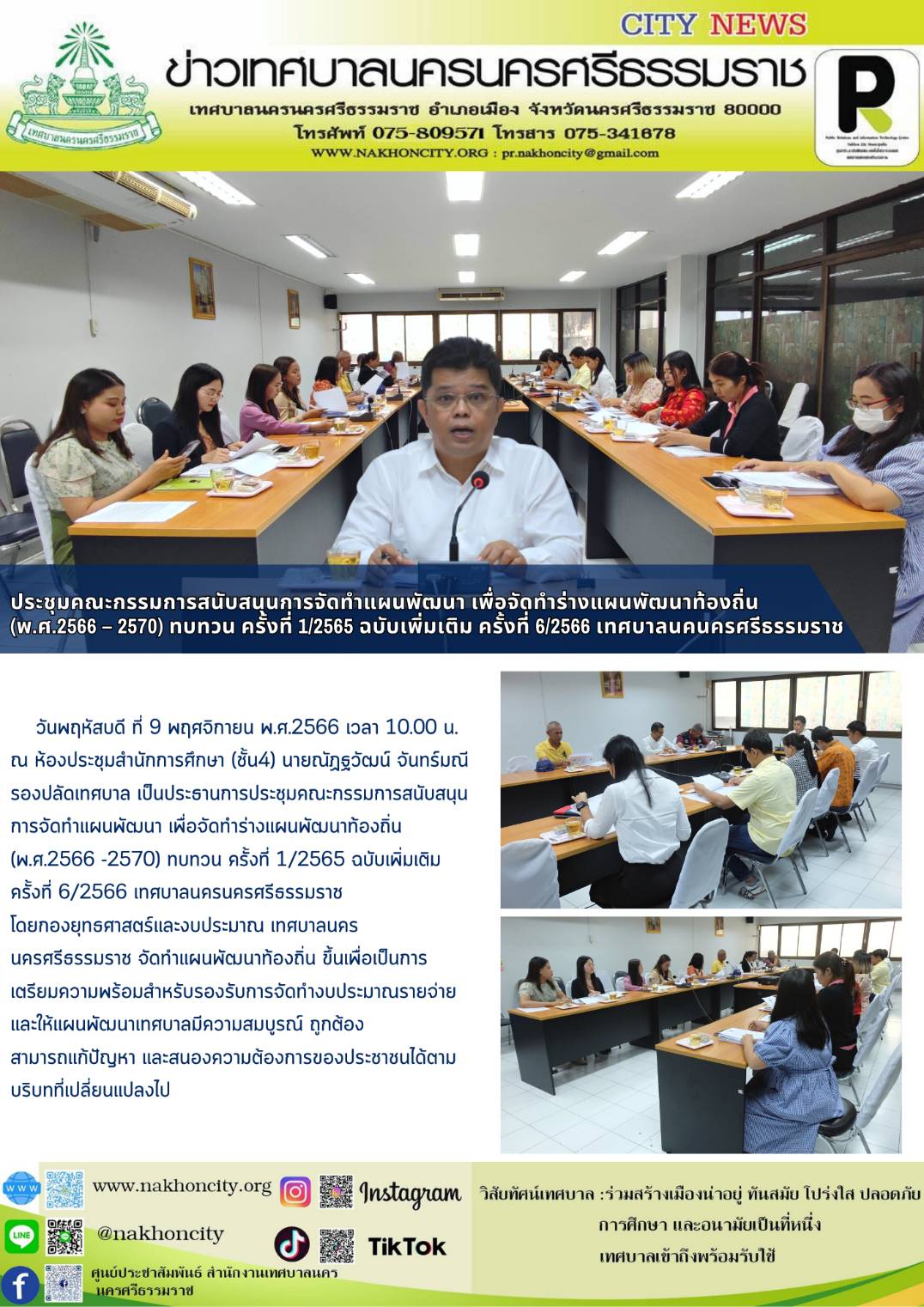 | เทศบาลนครนครศรีธรรมราช ประชุมคณะกรรมการสนับสนุนการจัดทำแผนพัฒนา เพื่อจัดทำร่างแผนพัฒนาท้องถิ่น (พ.ศ.2566 – 2570) ทบทวน ครั้งที่ 1/2565 ฉบับเพิ่มเติม ครั้งที่ 6/2566 เทศบาลนครนครศรีธรรมราช |