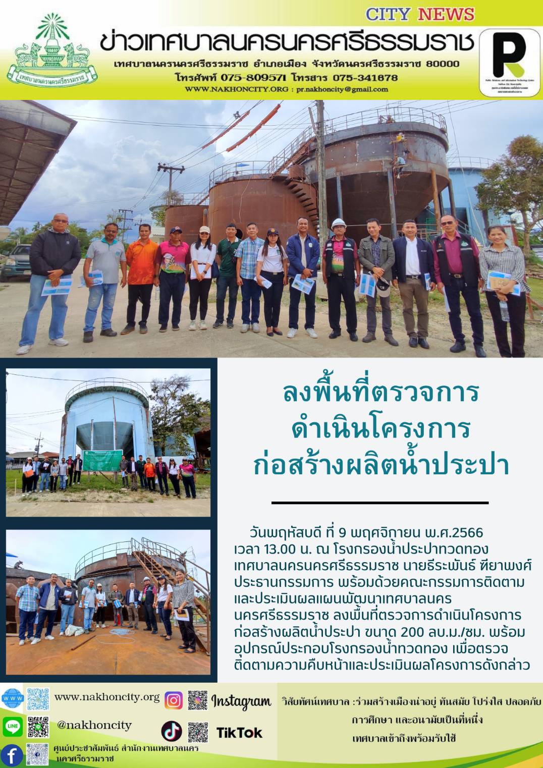 | วันพฤหัสบดี ที่ 9 พฤศจิกายน พ.ศ.2566 เวลา 13.00 น. ณ โรงกรองน้ำประปาทวดทอง เทศบาลนครนครศรีธรรมราช นายธีระพันธ์ ฑียาพงศ์ ประธานกรรมการ พร้อมด้วยคณะกรรมการติดตามและประเมินผลแผนพัฒนาเทศบาลนครนครศรีธรรมราช ลงพื้นที่ตรวจการดำเนินโครงการก่อสร้างผลิตน้ำประปา ขนาด 200 ลบ.ม./ชม. พร้อมอุปกรณ์ประกอบโรงกรองน้ำทวดทอง เพื่อตรวจติดตามความคืบหน้าและประเมินผลโครงการดังกล่าว ............ ภาพ//ข่าว//จันทร์จิรา ตรวจทาน//ฐิตินันท์ |