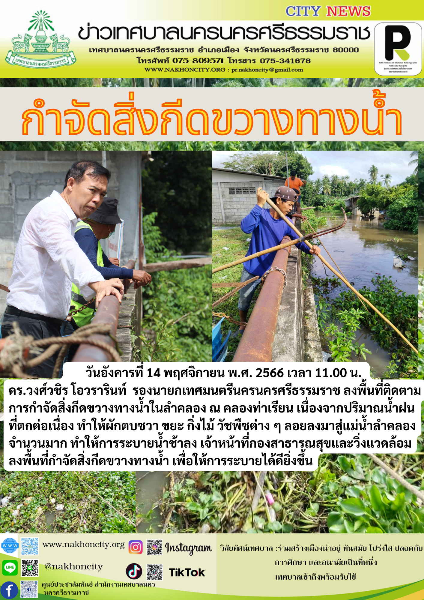 | วันอังคารที่ 14 พฤศจิกายน พ.ศ. 2566 เวลา 11.00 น. ดร.วงศ์วชิร โอวรารินท์รองนายกเทศมนตรีนครนครศรีธรรมราช ลงพื้นที่ติดตามการกำจัดสิ่งกีดขวางทางน้ำในลำคลอง ณ คลองท่าเรียน เนื่องจากบริมาณน้ำฝนที่ตกต่อเนื่อง ทำให้ผักตบชวา ขยะ กิ่งไม้ วัชพืชต่าง ๆ ลอยลงมาสู่แม่น้ำลำคลองจำนวนมาก ทำให้การระบายน้ำช้าลง เจ้าหน้าที่กองสาธารณสุขและวิ่งแวดล้อม ลงพื้นที่กำจัดสิ่งกีดขวางทางน้ำ เพื่อให้การระบายได้ดียิ่งขึ้น |