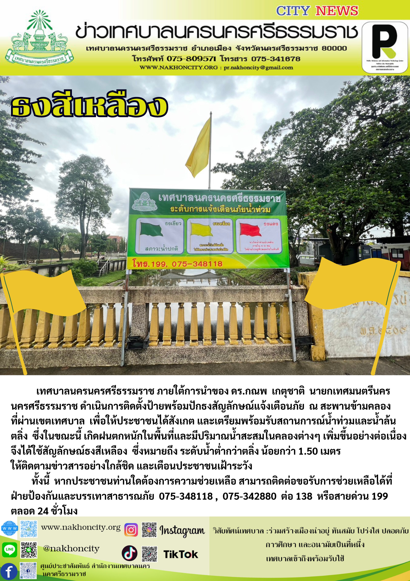 | เทศบาลนครนครศรีธรรมราช ภายใต้การนำของ ดร.กณพ เกตุชาติ นายกเทศมนตรีนครนครศรีธรรมราช ดำเนินการติดตั้งป้ายพร้อมปักธงสัญลักษณ์แจ้งเตือนภัย ณ สะพานข้ามคลอง ที่ผ่านเขตเทศบาล เพื่อให้ประชาชนได้สังเกต และเตรียมพร้อมรับสถานการณ์น้ำท่วมและน้ำล้นตลิ่ง ซึ่งในขณะนี้ เกิดฝนตกหนักในพื้นที่และมีปริมาณน้ำสะสมในคลองต่างๆ เพิ่มขึ้นอย่างต่อเนื่อง จึงได้ใช้สัญลักษณ์ธงสีเหลือง ซึ่งหมายถึง ระดับน้ำต่ำกว่าตลิ่ง น้อยกว่า 1.50 เมตร ให้ติดตามข่าวสารอย่างใกล้ชิด และเตือนประชาชนเฝ้าระวัง ทั้งนี้ หากประชาชนท่านใดต้องการความช่วยเหลือ สามารถติดต่อขอรับการช่วยเหลือได้ที่ ฝ่ายป้องกันและบรรเทาสาธารณภัย 075-348118 , 075-342880 ต่อ 138 หรือสายด่วน 199 ตลอด 24 ชั่วโมง