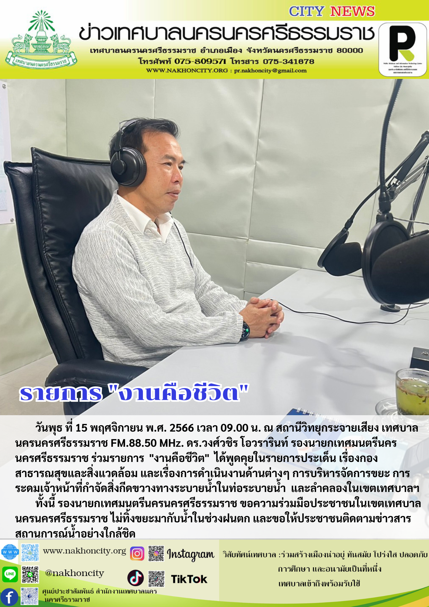 | ดร.วงศ์วชิร โอวรารินท์ รองนายกเทศมนตรีนครนครศรีธรรมราช ร่วมรายการ รายการ "งานคือชีวิต" ผ่านทาง สถานีวิทยุกระจายเสียง เทศบาลนครนครศรีธรรมราช FM.88.50 MHz. |