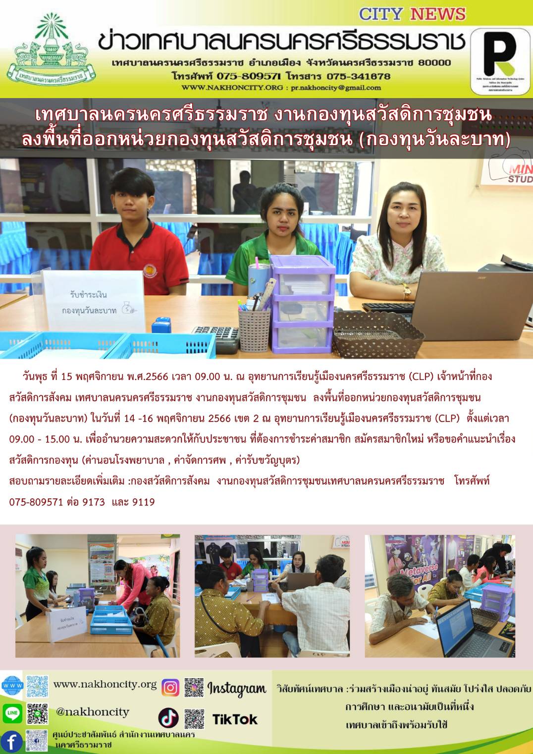 | เจ้าหน้าที่กองสวัสดิการสังคม เทศบาลนครนครศรีธรรมราช งานกองทุนสวัสดิการชุมชน ลงพื้นที่ออกหน่วยกองทุนสวัสดิการชุมชน (กองทุนวันละบาท) |