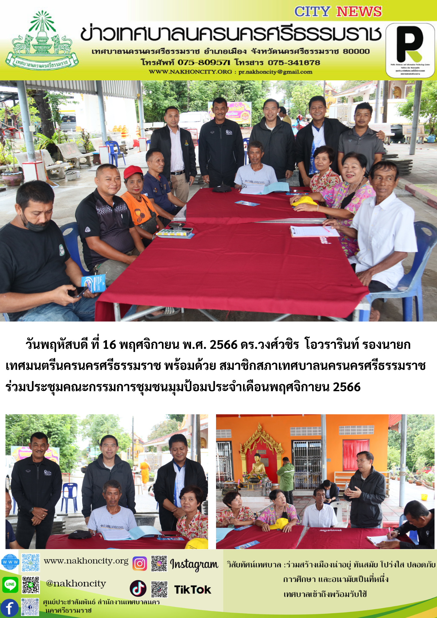 | ดร.วงศ์วชิร โอวรารินท์ รองนายกเทศมนตรีนครนครศรีธรรมราช พร้อมด้วย สมาชิกสภาเทศบาลนครนครศรีธรรมราช ร่วมประชุมคณะกรรการชุมชนมุมป้อมประจำเดือนพฤศจิกายน 2566 |