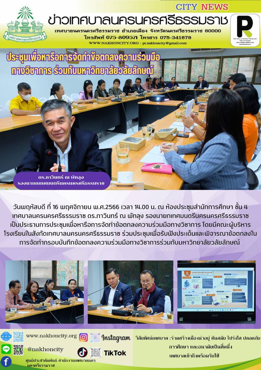 | ดร.ภาวินทร์ ณ พัทลุง รองนายกเทศมนตรีนครนครศรีธรรมราช เป็นประธานการประชุมเพื่อหารือการจัดทำข้อตกลงความร่วมมือทางวิชาการ |