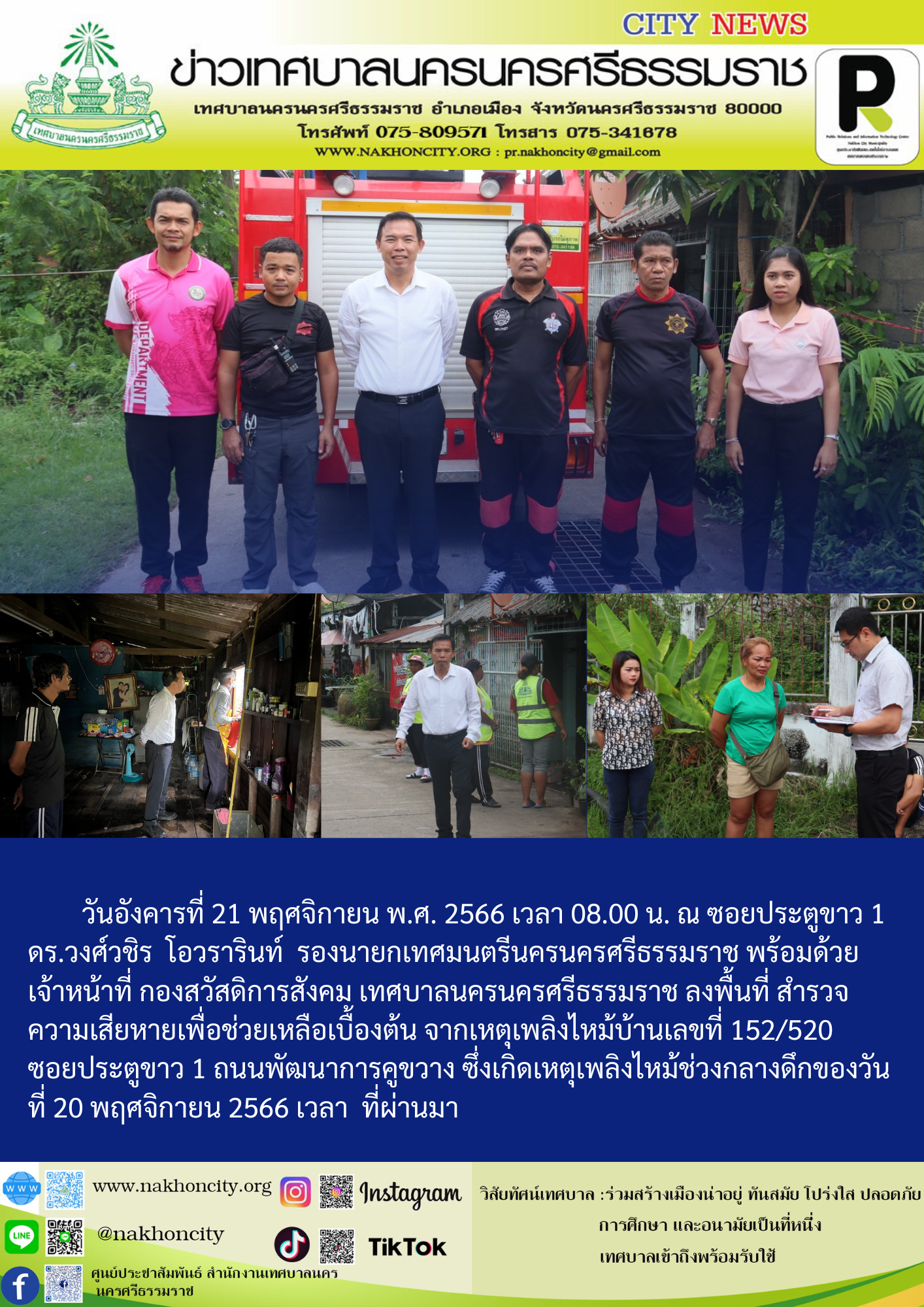 | วันอังคารที่ 21 พฤศจิกายน พ.ศ. 2566 เวลา 08.00 น. ณ ซอยประตูขาว 1 ดร.วงศ์วชิร โอวรารินท์ รองนายกเทศมนตรีนครนครศรีธรรมราช พร้อมด้วยเจ้าหน้าที่ กองสวัสดิการสังคม เทศบาลนครนครศรีธรรมราช ลงพื้นที่ สำรวจความเสียหายเบื้อง เหตุเพลิงไหม้บ้าน บ้านเลขที่ 152/520 ซอยประตูขาว 1 ถนนพัฒนาการคูขวาง ซึ่งเกิดเหตุเพลิงไหม้ช่วงกลางดึกของวันที่ 20 พฤศจิกายน 2566 เวลา ที่ผ่านมา