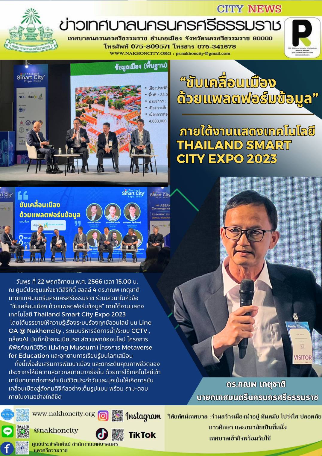 | วันพุธ ที่ 22 พฤศจิกายน พ.ศ. 2566 เวลา 15.00 น.  ณ ศูนย์ประชุมแห่งชาติสิริกิติ์ ฮอลล์ 4 ดร.กณพ  เกตุชาติ  นายกเทศมนตรีนครนครศรีธรรมราช  ร่วมเสวนาในหัวข้อ “ขับเคลื่อนเมือง ด้วยแพลตฟอร์มข้อมูล” ภายใต้งานแสดงเทคโนโลยี Thailand Smart City Expo 2023   |