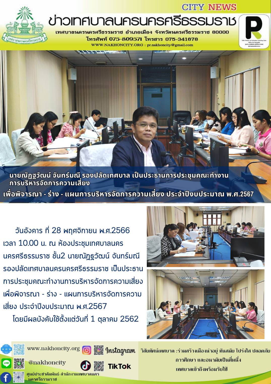 | วันอังคาร ที่ 28 พฤศจิกายน พ.ศ.2566 เวลา 10.00 น. ณ ห้องประชุมเทศบาลนครนครศรีธรรมราช ชั้น2 นายณัฏฐวัฒน์ จันทร์มณี รองปลัดเทศบาลนครนครศรีธรรมราช เป็นประธานการประชุมคณะทำงานการบริหารจัดการความเสี่ยง เพื่อพิจารณา - ร่าง - แผนการบริหารจัดการความเสี่ยง ประจำปีงบประมาณ พ.ศ.2567 โดยมีผลบังคับใช้ตั้งแต่วันที่ 1 ตุลาคม 2562 .......... ภาพข่าว//จันทร์จิรา |