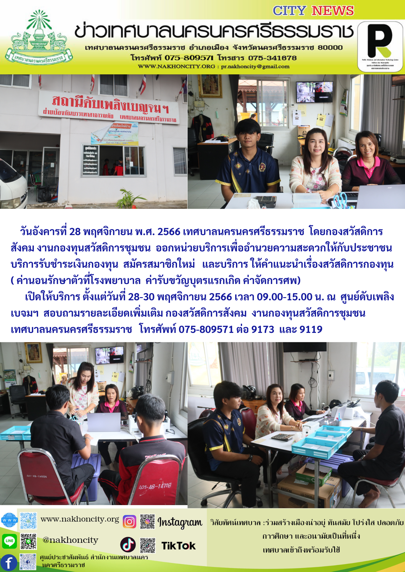 | เทศบาลนครนครศรีธรรมราช โดยกองสวัสดิการสังคม งานกองทุนสวัสดิการชุมชน ออกหน่วยบริการเพื่ออำนวยความสะดวกให้กับประชาชน บริการรับชำระเงินกองทุน สมัครสมาชิกใหม่ และบริการ ให้คำแนะนำเรื่องสวัสดิการกองทุน |