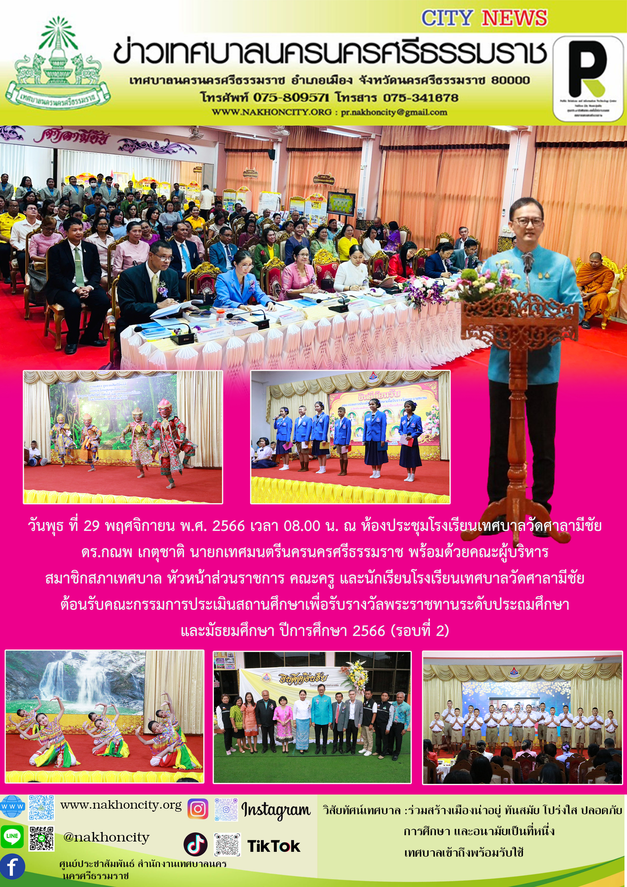 | ดร.กณพ เกตุชาติ นายกเทศมนตรีนครนครศรีธรรมราช พร้อมด้วยคณะผู้บริหาร สมาชิกสภาเทศบาล หัวหน้าส่วนราชการ คณะครู และนักเรียนโรงเรียนเทศบาลวัดศาลามีชัย ต้อนรับคณะกรรมการประเมินสถานศึกษาเพื่อรับรางวัลพระราชทานระดับประถมศึกษาและมัธยมศึกษา ปีการศึกษา 2566 (รอบที่ 2) |